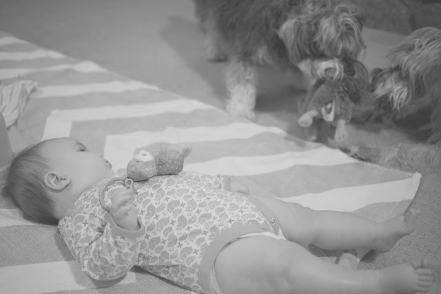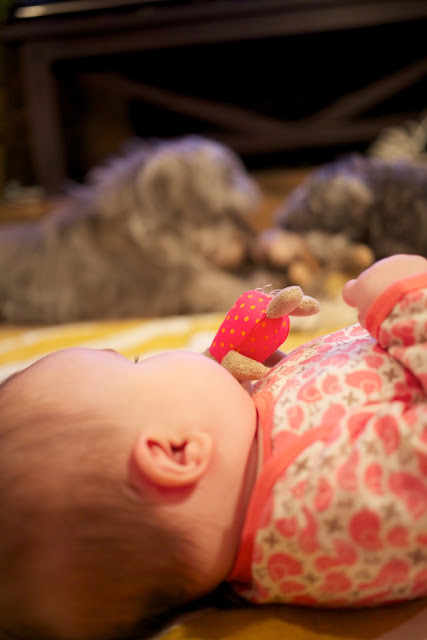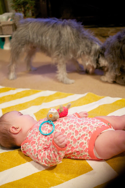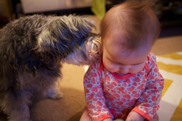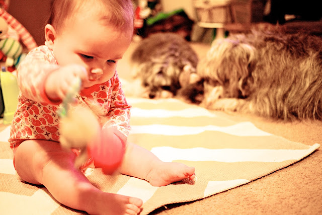 And then, when the baby IS around, I think, “Gosh, they’re obsessed with her! Surely they don’t regret having her around, right?” Since she’s on the move now, the dogs have begun to view her more like a puppy–which is both good and bad. Oscar loves to bring E.V. his toys, dragging them around her to entice her into playing (which she does sometimes). He gets so excited when playing with her that he often mini-bites her pajamas (and has been known to grab her by the footie and pull her along the floor!). The crawling has freaked them out a little bit, though; Oscar has yelped at her a few times as she’s armied toward him, as if to say, “Hey! It’s moving! Help!” Little Olive simply scampers away when the baby’s headed in her direction, which I can’t blame her for since Emma Vance LOVES to pull on their fur with all her might. (We have to instruct her to be gentle over and over, and slowly but surely she seems to be getting it.) We try to encourage the three of them to be buddies, so we purposely pet Oscar and Olive when they’re nice to her, and my smart Olive has taken to licking E.V.’s ear to get rubbins’, which makes me laugh. In return, Emma Vance loves her dogs, delighting in every bit of interaction she can get with them. She’s fascinated watching them play tug o’ war with a rag bone or chasing their ball; it’s like a live action movie in her baby world! She gets startled by their barks and giddy at the chance to touch them. As she continues to grow, I can’t help but dream that they’ll adopt her as one of their own, that they’ll go from Daddy’s Dogs to E.V.’s Dogs one day. Hey, a girl needs her dogs…
