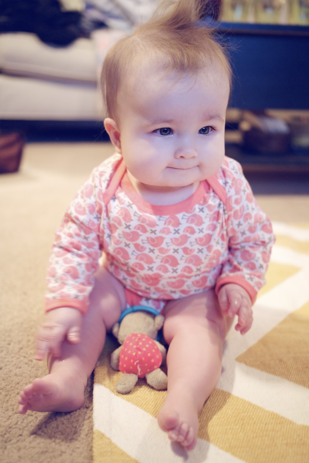 And then, when the baby IS around, I think, “Gosh, they’re obsessed with her! Surely they don’t regret having her around, right?” Since she’s on the move now, the dogs have begun to view her more like a puppy–which is both good and bad. Oscar loves to bring E.V. his toys, dragging them around her to entice her into playing (which she does sometimes). He gets so excited when playing with her that he often mini-bites her pajamas (and has been known to grab her by the footie and pull her along the floor!). The crawling has freaked them out a little bit, though; Oscar has yelped at her a few times as she’s armied toward him, as if to say, “Hey! It’s moving! Help!” Little Olive simply scampers away when the baby’s headed in her direction, which I can’t blame her for since Emma Vance LOVES to pull on their fur with all her might. (We have to instruct her to be gentle over and over, and slowly but surely she seems to be getting it.) We try to encourage the three of them to be buddies, so we purposely pet Oscar and Olive when they’re nice to her, and my smart Olive has taken to licking E.V.’s ear to get rubbins’, which makes me laugh. In return, Emma Vance loves her dogs, delighting in every bit of interaction she can get with them. She’s fascinated watching them play tug o’ war with a rag bone or chasing their ball; it’s like a live action movie in her baby world! She gets startled by their barks and giddy at the chance to touch them. As she continues to grow, I can’t help but dream that they’ll adopt her as one of their own, that they’ll go from Daddy’s Dogs to E.V.’s Dogs one day. Hey, a girl needs her dogs…
