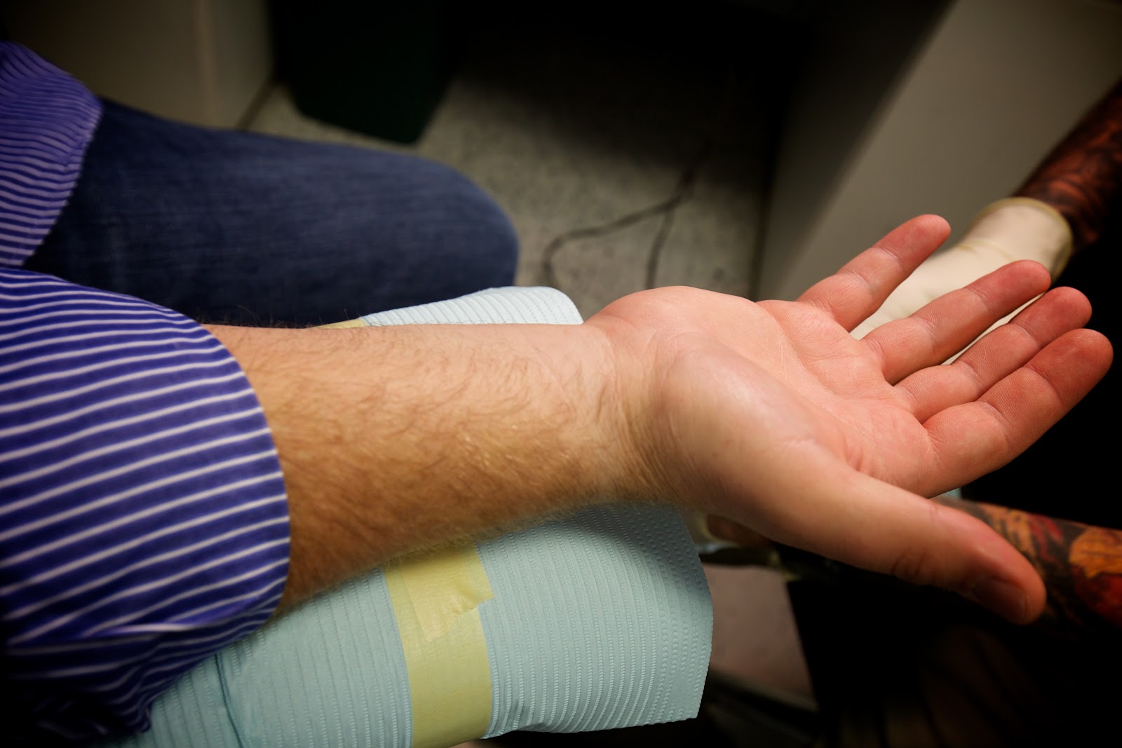 Once he had said it out loud, the night was set in motion. We settled the bill, started calling tattoo parlours in the area (note to self: tattoo places in suburbia close way early by tattoo community standards), and then headed into Atlanta before Tim could chicken out. Half an hour later we pulled up to Timeless Tattoos. (Which, in its own classy way happens to be next to an adult-type shop, which Ryan thought was hilarious to park my distinct Durango in front of. :/) He’d been set on getting “abide” on his wrist for a while, and quickly decided on a font. There were no other crazies in the shop with us, so he was seated in a chair immediately. He was tough (but did calmly, forcedly admit, “Oh man, that hurts…”) and maybe ten minutes later he had ink! The artist did a great job, and afterwards I think the adrenaline hit everyone. HE DID IT! I’m so stinkin’ proud that he actually went through with it, although this morning it did feel a little bit like a dream–the kind where I’d call up Scotty and say, “I had this weird dream last night where we all ate Mexico City cheese dip and then Tim got a tattoo…” I’m pretty sure Tim probably woke up thinking the same thing, although his aching wrist quickly reminded him that he actually did it.