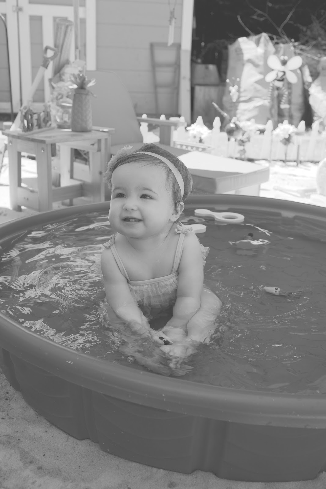 To celebrate Memorial Day, Ryan’s mom, Wendi, hosted a poolside barbecue for the family today. Although my pasty legs failed to make an appearance :), Emma Vance was smitten with her nanny’s newest backyard addition–a little baby “beach” complete with miniature lounge chair and real sand!