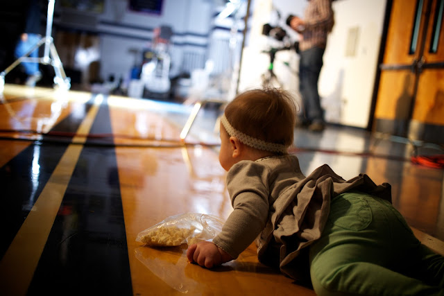 This morning’s shoot was a bit farther away than yesterday’s was, so I timed Emma Vance’s naps so that she’d sleep during the car rides to and from the location. This arrangement made for an extra energetic baby who was full of coos and babbles during filming, so we were thankful that the director was empathetic. :) In order to wear her out, we ran around a bit, visiting the make-up room, the green room, the bathroom…pretty much any “room” we could get into! Once it was time to actually shoot, though, we settled down in a spot off to the side and watched the magic. Emma Vance was enthralled, as was I. This stuff never ceases to amaze me!