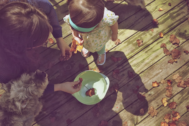 To celebrate today being the first official day of Fall, Emma Vance and I (and Oscar and Olive) decided to collect some colorful leaves for fun. (Okay, so maybe “colorful” isn’t the most accurate word to describe today’s leaf selection, but “brown” just sounds so…well, sad.) The good news is that having a toddler means you can get harebrained ideas and have someone gladly join you in your adventures without looking at you like you’re a crazy person. (I figure we’ve got a solid decade or so before the eye rolling begins.) In fact, having a toddler not only means that you have a willing partner, but that you have an enthusiastic partner! As we traipsed outside this afternoon, there were giggles and excitement (and maybe an overly-ambitious attempt that ended up with a tumble down the deck stairs for one of us) and then squeals of delight as we filled our bowl with fallen leaves.
