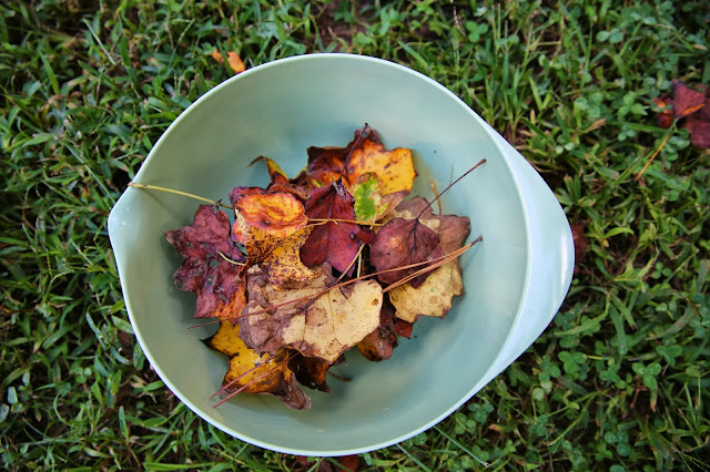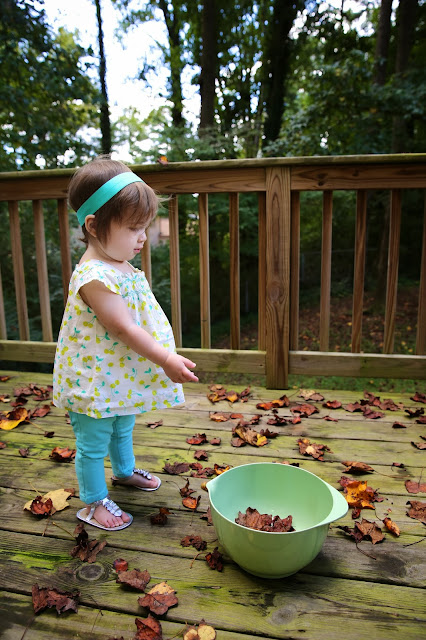 To celebrate today being the first official day of Fall, Emma Vance and I (and Oscar and Olive) decided to collect some colorful leaves for fun. (Okay, so maybe “colorful” isn’t the most accurate word to describe today’s leaf selection, but “brown” just sounds so…well, sad.) The good news is that having a toddler means you can get harebrained ideas and have someone gladly join you in your adventures without looking at you like you’re a crazy person. (I figure we’ve got a solid decade or so before the eye rolling begins.) In fact, having a toddler not only means that you have a willing partner, but that you have an enthusiastic partner! As we traipsed outside this afternoon, there were giggles and excitement (and maybe an overly-ambitious attempt that ended up with a tumble down the deck stairs for one of us) and then squeals of delight as we filled our bowl with fallen leaves.