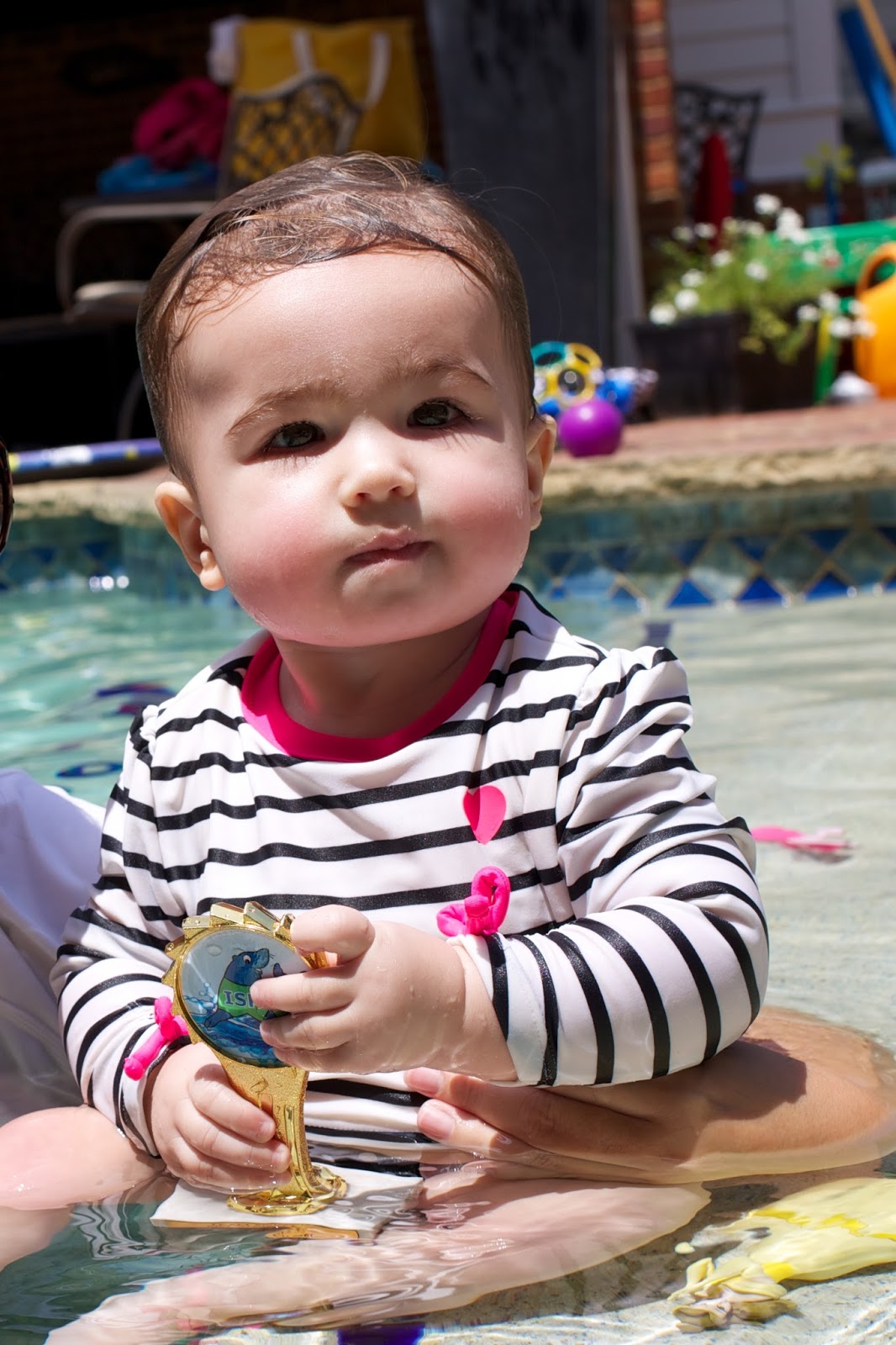 Part of her final lesson included my learning how to practice with her–meaning it was time for me to get in the pool as well. (Seeing as how my poor body hasn’t seen the light of day since having a baby, I opted for the sun-protecting version of a “suit,” which I’m sure everyone appreciated. Ha!) Learning how to practice her floating was a little harder than I expected, and Ashlee joked, “Y’all thought I was just hanging out in here with them, right?” :) But after a few attempts, a few mouthfuls of water (for E.V.) and a few panicked moments (from me), I got the hang of it. Emma Vance tested out by floating on her own for what seemed like forever, although I’m sure it was probably only 60 seconds. She showed us how she could roll over (even after being dunked bum-over-noggin) and then she was officially a graduate! (She even got her first trophy, which says, “I can swim! Just watch me!” How cute is that?)