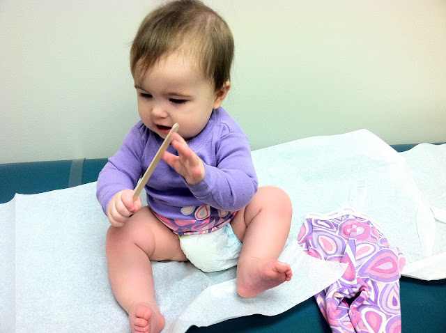 There wasn’t anything super significant about the visit. E.V. is on-track developmentally, gaining weight well and full of personality. She gained 1 lb. 3 oz. this month, weighing in at 19 lbs. 7 oz. (70th percentile). She grew an inch and is now 27″ tall (25th percentile), while her head grew 2 cm (75th percentile). Big brain, short legs, full belly? Sounds like her mom to me! (Ha!) The doctor had to give her a tongue depressor to keep her focused and entertained during her examination. Sounds like her dad to me!