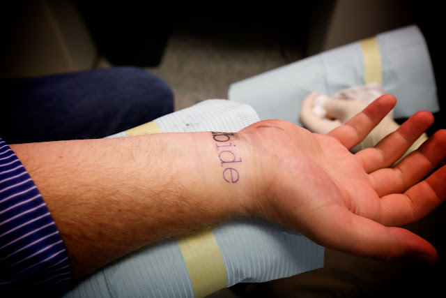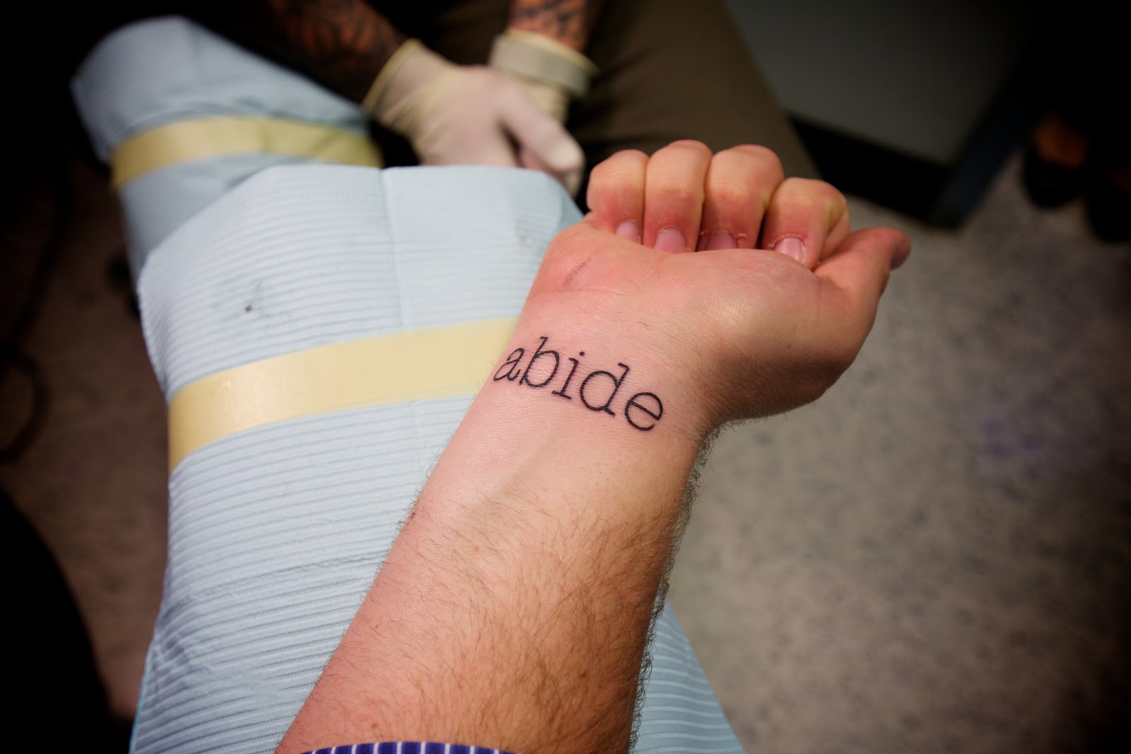 Once he had said it out loud, the night was set in motion. We settled the bill, started calling tattoo parlours in the area (note to self: tattoo places in suburbia close way early by tattoo community standards), and then headed into Atlanta before Tim could chicken out. Half an hour later we pulled up to Timeless Tattoos. (Which, in its own classy way happens to be next to an adult-type shop, which Ryan thought was hilarious to park my distinct Durango in front of. :/) He’d been set on getting “abide” on his wrist for a while, and quickly decided on a font. There were no other crazies in the shop with us, so he was seated in a chair immediately. He was tough (but did calmly, forcedly admit, “Oh man, that hurts…”) and maybe ten minutes later he had ink! The artist did a great job, and afterwards I think the adrenaline hit everyone. HE DID IT! I’m so stinkin’ proud that he actually went through with it, although this morning it did feel a little bit like a dream–the kind where I’d call up Scotty and say, “I had this weird dream last night where we all ate Mexico City cheese dip and then Tim got a tattoo…” I’m pretty sure Tim probably woke up thinking the same thing, although his aching wrist quickly reminded him that he actually did it.