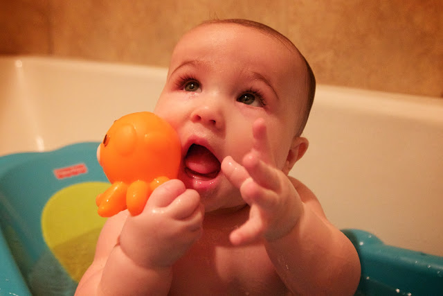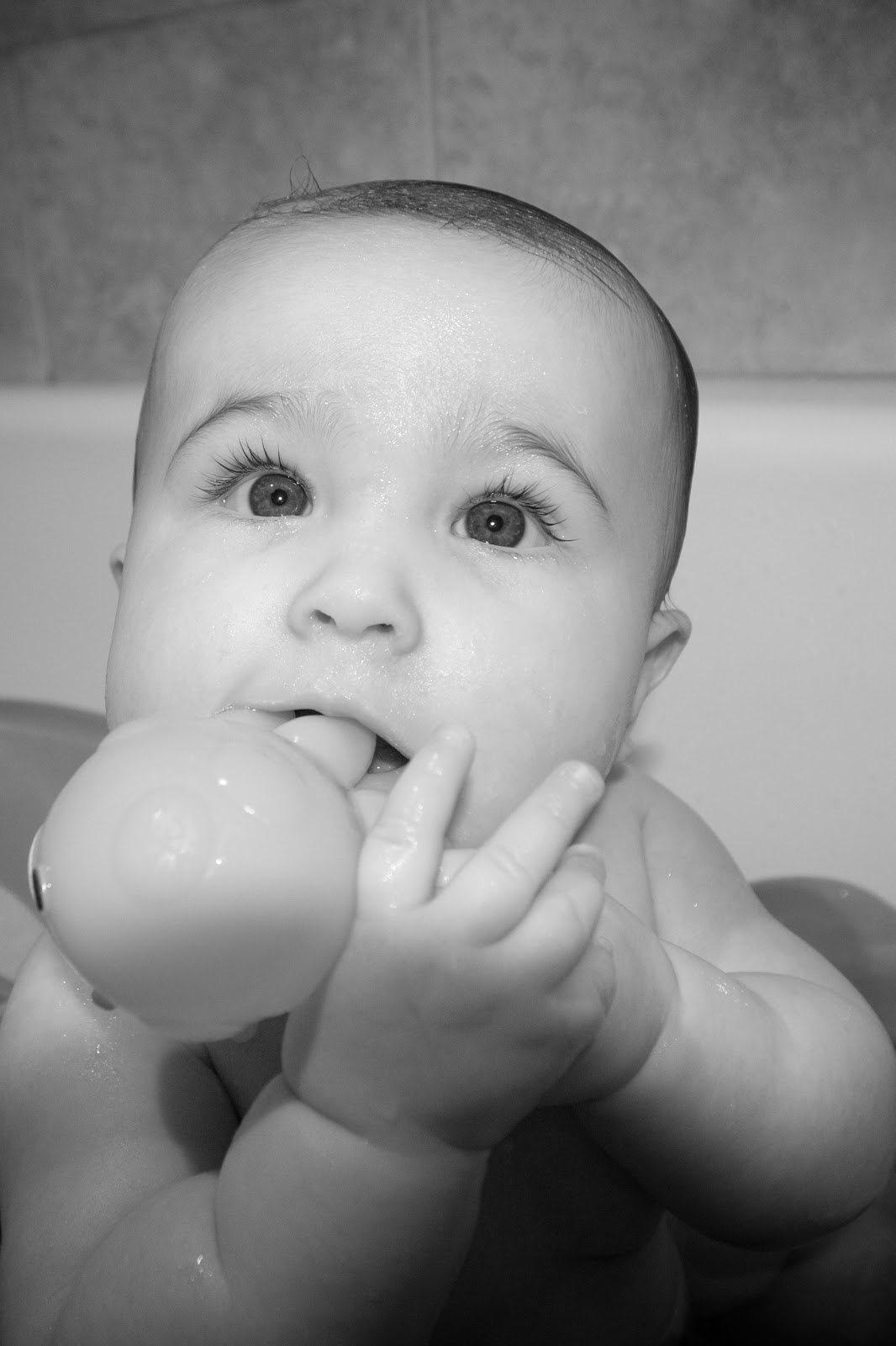 Bath time has been one of Emma Vance’s favorite daily baby chores since she was a newborn. Now that she’s sitting up and playing like a big girl, bath time has become a whole new game, full of toys to grab and water to splash. She likes to put her hands and face under the waterfall spout at the beginning of each bath, and at the end, when she sees me reaching for her towel, she always pleads to me with puppy dog eyes to stay a little longer…which often times I oblige.