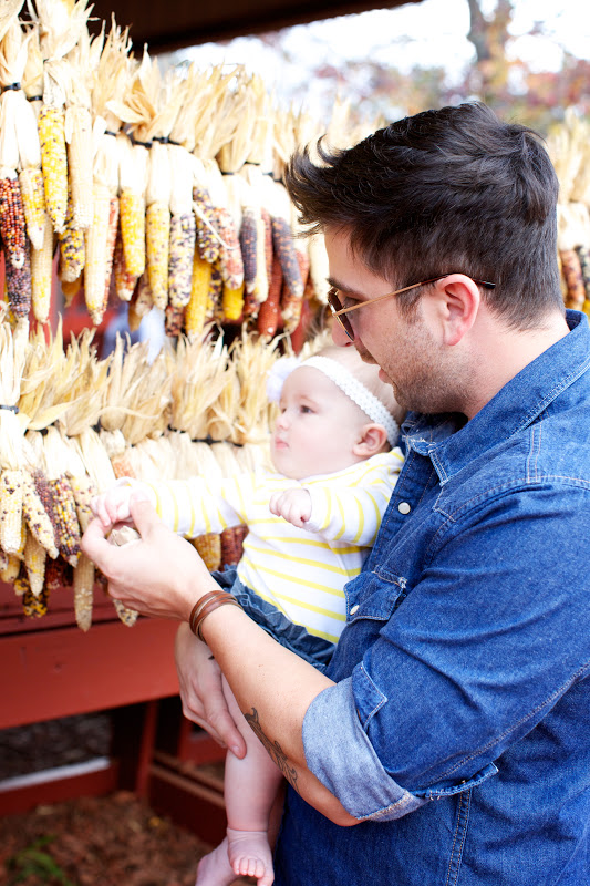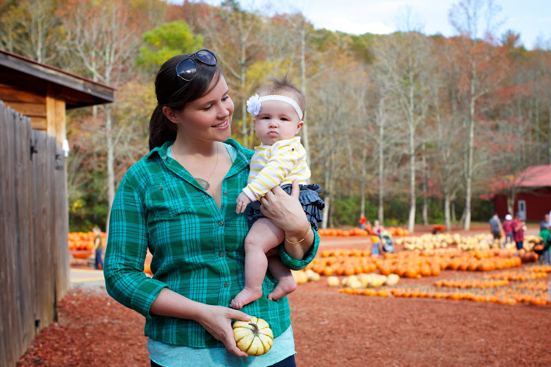 Ryan and I (like many Atlantans) make the traditional trek to the North Georgia mountains to pick out our Halloween pumpkin each autumn. Usually we take a leisurely day to drive up, peruse the patch, choose a few gourds for our front stoop, then drive over to Hillcrest Orchards for apple cider doughnuts (mmm). This year, as October has slipped quickly by, I was worried we wouldn’t be able to find time to go. I had conflicting thoughts: We’re soooo busy, and Emma Vance won’t remember this first year at Burt’s, so why make the effort? On the other hand, it’s her first fall, so it would be sad to miss out on the festivities. With Halloween quickly approaching, Ryan convinced me (despite my we-should-be-doing-something-productive-because-we’re-moving-in-a-week attitude) that Friday was a perfect day for pumpkin hunting, so we loaded up the baby and made the trip.