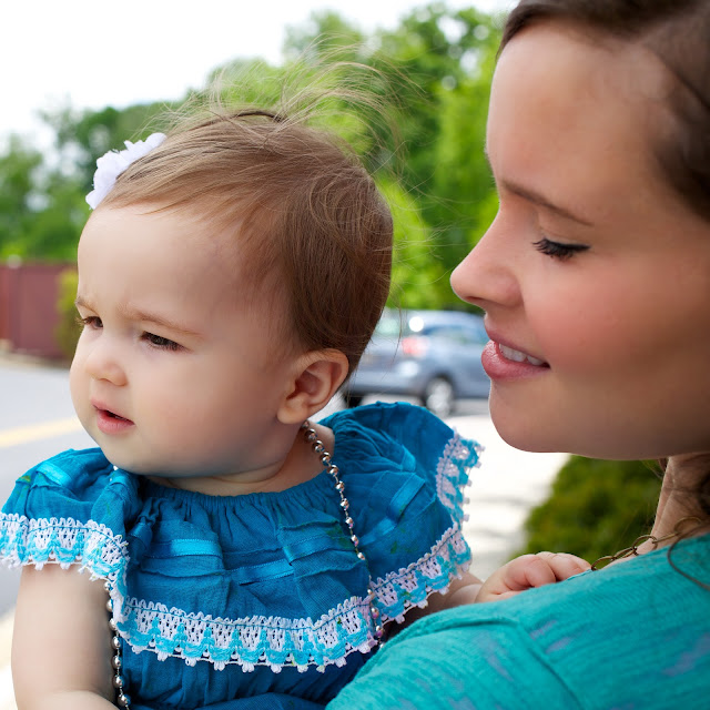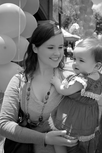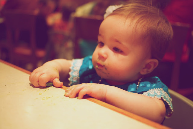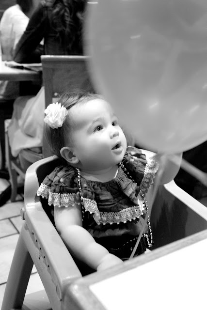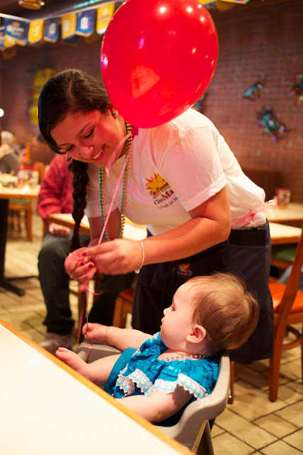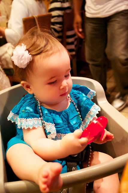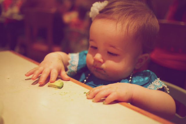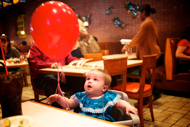 There was a bit of a wait, but we didn’t mind since E.V. loves to keep us occupied. Everyone commented on how cute she was and how adorable her outfit was, and one of the employees even gave her a beaded necklace (which totally won over E.V.’s affections). When we sat down, I ordered an avocado to feed Emma Vance (and to keep her from complete boredom) even though she had already had her official lunch at home. It’s her latest favorite food, and after scarfing down the WHOLE thing, I ordered another half–which also quickly disappeared along with a small bottle and a kids’ water! (Can you say “growth spurt?!?”) Her mouth was full of food and smiles all during our meal, and we were more than happy to hang out with our little lady in public for a couple hours. She was such a good girl that our server rewarded her with her first balloon, and, man, was she pumped about it!