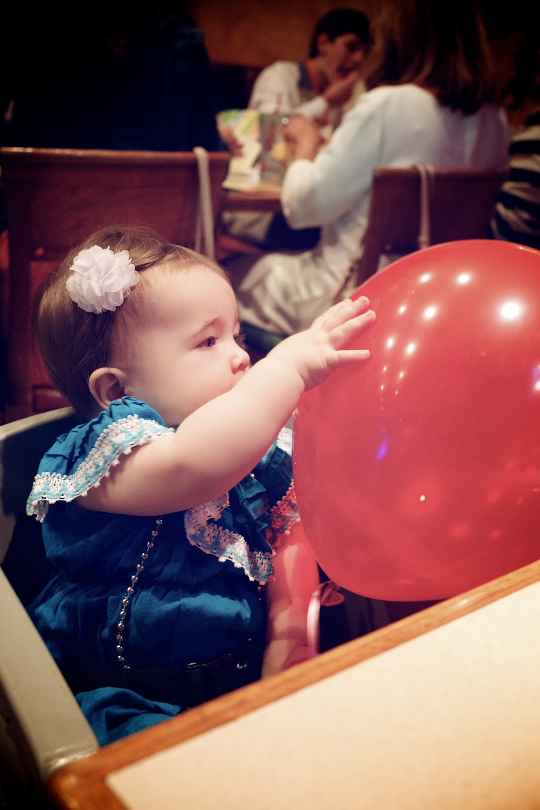 There was a bit of a wait, but we didn’t mind since E.V. loves to keep us occupied. Everyone commented on how cute she was and how adorable her outfit was, and one of the employees even gave her a beaded necklace (which totally won over E.V.’s affections). When we sat down, I ordered an avocado to feed Emma Vance (and to keep her from complete boredom) even though she had already had her official lunch at home. It’s her latest favorite food, and after scarfing down the WHOLE thing, I ordered another half–which also quickly disappeared along with a small bottle and a kids’ water! (Can you say “growth spurt?!?”) Her mouth was full of food and smiles all during our meal, and we were more than happy to hang out with our little lady in public for a couple hours. She was such a good girl that our server rewarded her with her first balloon, and, man, was she pumped about it!