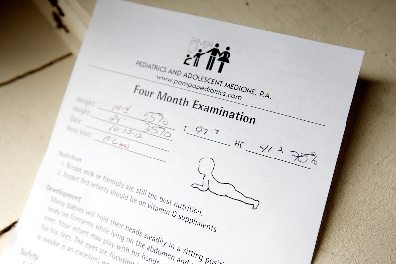 Other than her stats, E.V. was her usual, charming self today. She propped herself up extraordinarily well, rolled over from her tummy, and stood very tall for the doctor. And, of course, the talking. Oh, the talking. We were having very serious discussions about her health, and E.V. would just not stop babbling! The doctor and I just kept laughing because it was so funny. I asked her if this was normal, and she grinned and said it was an “exceptional amount of talking.” (I’m sure she uses that term, “exceptional,” with all her new parents, but I have to say it still feels good.)