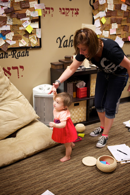 E.V. and I visited Ryan on Tuesday, sneaking a peek in on his class and having lunch “behind the scenes.” Emma Vance always loves a crowd to entertain, and with a bunch of kids and adults hanging around and eating, she was ecstatic! In fact, she pretty much ignored Ryan and I in favor of putting on a show for everyone–walking, crawling, banging together shoes, clapping for herself. She is a natural ham–a natural performer–and as Ryan walked me to the car, baby in tow, I joked, “So how old does Emma Vance have to be to sign up for cue52?” The bigger question is this: Will she opt to sign up for film class? We’ll have to see what Dad says about that. :)