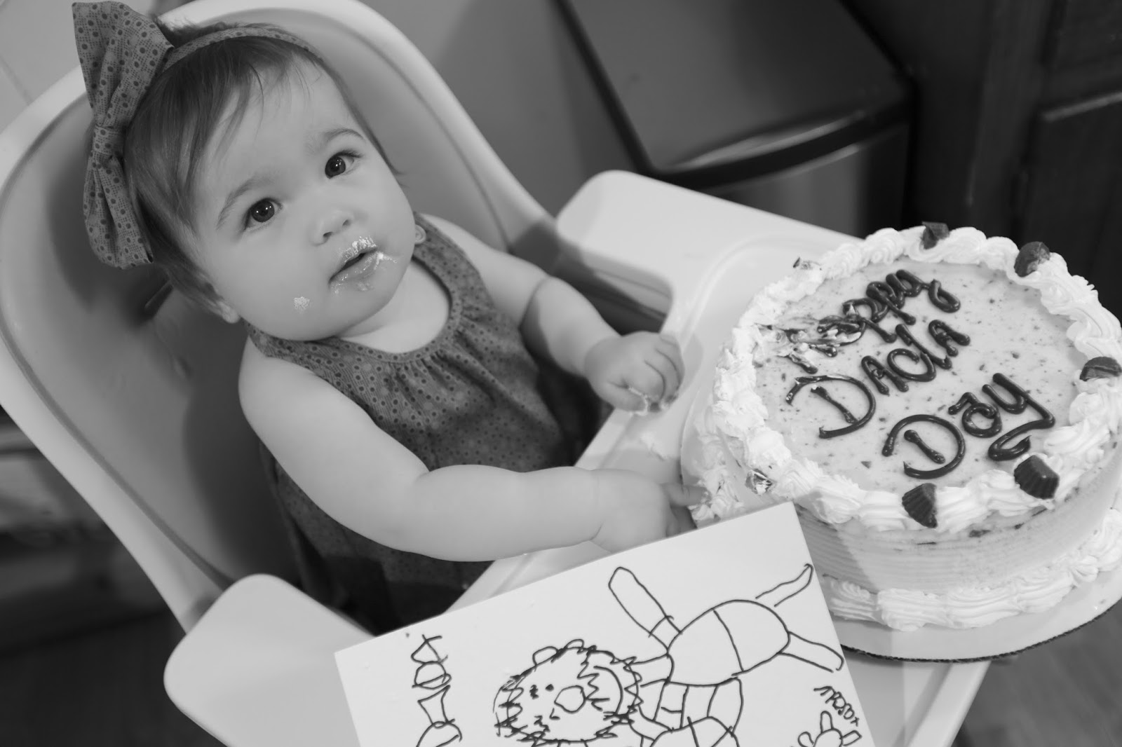 Mid-morning today, I went downstairs under the guise of feeding E.V. lunch, and a few minutes into the “meal,” I called up to Ryan and asked him if he could put a shirt on and grab a few things from outside for me. (Notice I asked him to put on a shirt, which he ignored because he doesn’t mind if the neighbors think of him as a redneck…) He was nice enough to oblige even though technically it was “his” day, and when he stepped into the kitchen, Emma Vance surprised him with her Dada Day gifts. Okay, so maybe she had already dug into his cake, eating a coveted chunk of Reese’s Cup and a handful of frosting within only a two-minute window, but with the majority of the cake in tact, Ryan was ecstatic. (I’m pretty sure he’ll pay her back with years of stolen Halloween candy–“to make sure it’s not poisoned.”)  They both enjoyed a little more frosting before Dada took his gifts away from her, which did not make E.V. happy. I don’t think she quite got the idea that the cake wasn’t hers, which I’d feel bad about if she wasn’t about to get a {smash} cake all to herself in a few weeks. :)