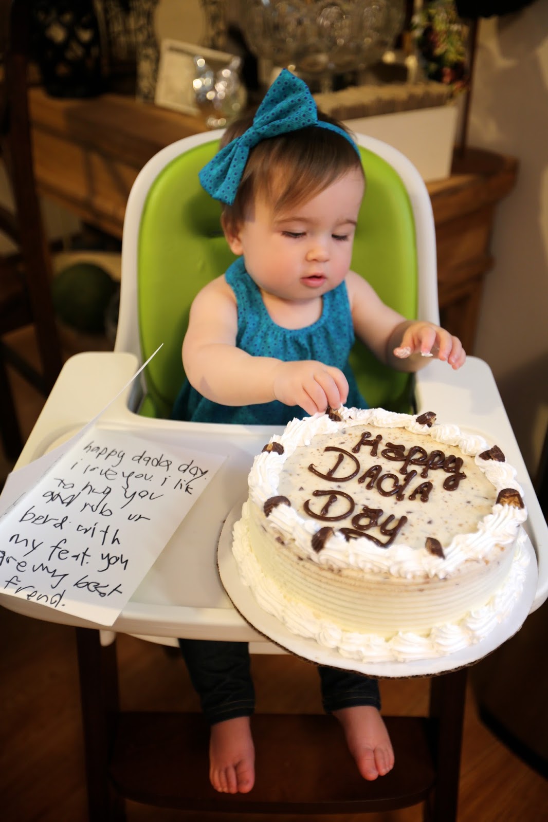 Ryan’s favorite cake in the entire world is Dairy Queen’s Reese’s Pieces Blizzard Cake (with crunchies on the inside of course), so I picked one up yesterday and hid it in the freezer under the frozen fruits and veggies, where I knew Ryan would never find it. E.V. had insisted that the cake read “Happy Dada Day” since “father” is a little too advanced for her to say right now, and despite the confused look the DQ cashier gave me, I think it was appropriate for our family. Once we had the cake, I helped her write a card, and although the card was a little elementary, it wasn’t too bad for a baby. ;) Our little Dada Day celebration was all set!