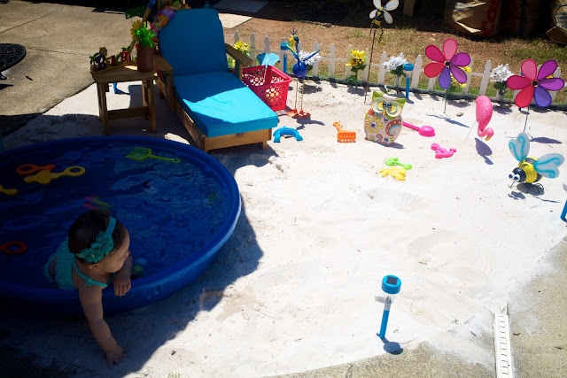 To celebrate Memorial Day, Ryan’s mom, Wendi, hosted a poolside barbecue for the family today. Although my pasty legs failed to make an appearance :), Emma Vance was smitten with her nanny’s newest backyard addition–a little baby “beach” complete with miniature lounge chair and real sand!