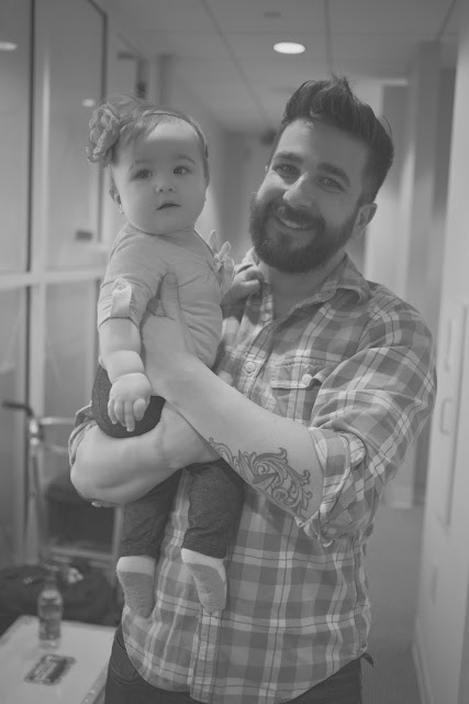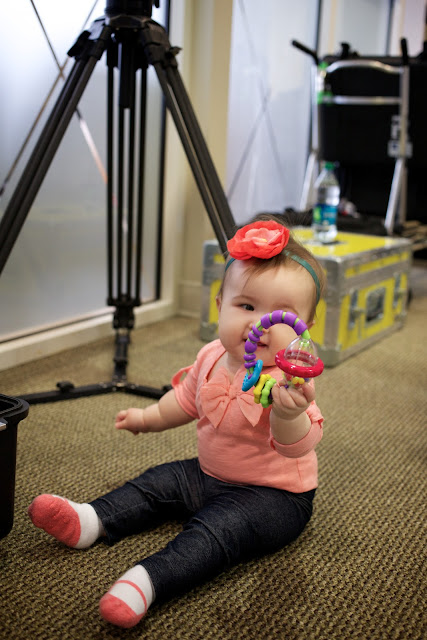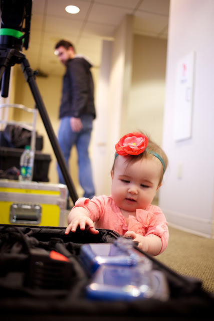 Now that E.V.’s a little older, it was about time to get her on set with Ryan. With two big, back-to-back shoots this week, Ryan has been a little stressed, so when his client for tomorrow’s shoot requested that I come by the set with the baby, I was a bit nervous–and so was Ryan. (The unpredictability that comes along with having a baby in tow is NOT a good thing in that environment.) We decided to oblige, cross our fingers and hope that she was good. Then, a few days later, today’s client ALSO requested little Miss Emma Vance’s presence at their shoot! Because of the added stress, I decided NOT to tell Ryan in advance we were coming. This morning, as he packed up, I snuck in a tidbit about my driving down to the set just to give him a little warning. :) He was surprisingly happy, and so we bundled up and headed into the city for “Take Your Daughter to Work Day” (well, at least according to the Shove family calendar).