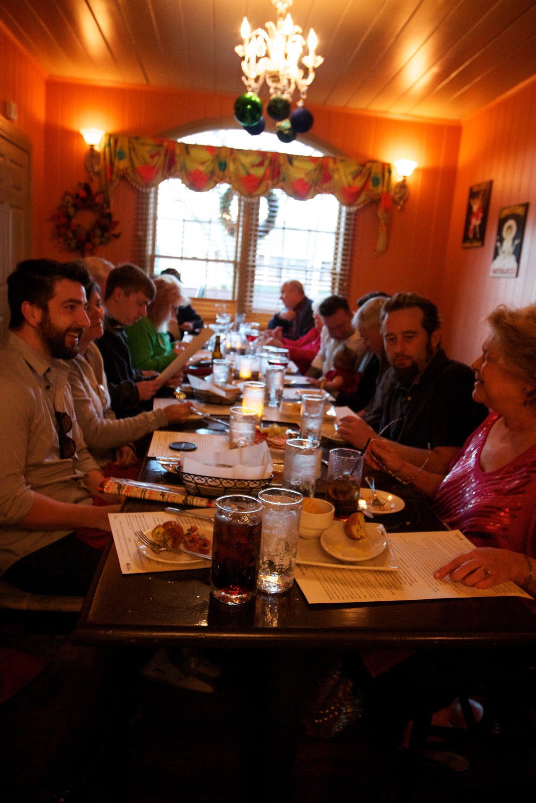 Bedtime came too quickly, making their first visit a quick one, but Emma Vance has gotten the chance to hang out with Nana and Pop a few times during the last week. This evening, the whole gang (including Ryan’s family, my family, and some of Wendi’s neighbors) all went to dinner compliments of Wendi and Mike (Thanks!) at La Casa in downtown Alpharetta to officially start the 2012 Christmas festivities. Emma Vance got all dressed up in her fancy Christmas dress (Thanks to Grandma!) for the occasion. It was a relaxing evening full of good food and good company, and E.V. was excited to see everyone.