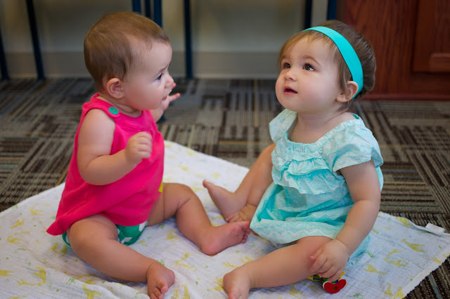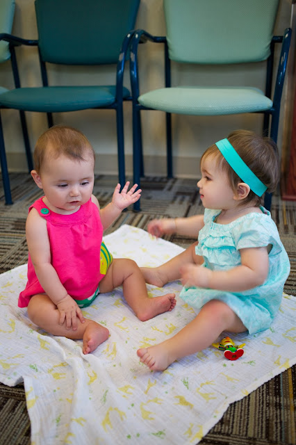 Why didn’t Alli (Clara’s mom) and I ever think of this before??? I mean, this was mom-multitasking at its best. Not only did we get to hang out for a bit with the girls, but as our appointments were so close together, we got to run into one another as we carried the babies here and there, comparing stats and stories as the appointments progressed. (Spoiler alert: Clara is WAY bigger than E.V. was at her age six months ago–and practically bigger than her even now!) However, since her appointment was 15 minutes before ours, Clara got called back before us, leaving me with a boisterous and newly lonely baby to handle in the waiting room. Cue organic corn puffs, my secret “quiet” weapon. Thankfully we only had a few minutes of overlap before meeting with the nurse to weigh-in.