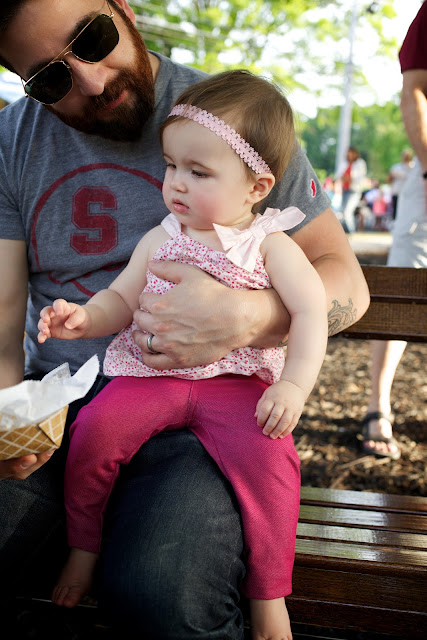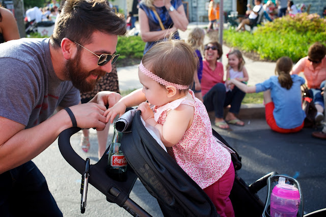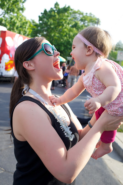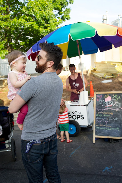 The weather was warm and summery, the sound of live music reverberated off the old brick buldings, and the smell of barbecue and french fries danced through the evening air. I can’t believe we’ve missed out on this all spring! Shame on us for not taking advantage of the community (and delicious food!) right in our own backyard. We visited The Fry Guy, W.O.W. and (of course) King of Pops, purposely leaving the other trucks for another visit. We listened to a live band (young kids testing out their courage and talent). We ran into folks from various aspects of our lives. It felt like a small town, which we loved. And, of course, E.V. had an amazing time people-watching (and then subsequently performing for those people once she’d gotten their attention). She even enjoyed her first King of Pops, and I’m pretty sure she was ob-sessed with the chocolate sea salt pop we bought to “share.” :)
