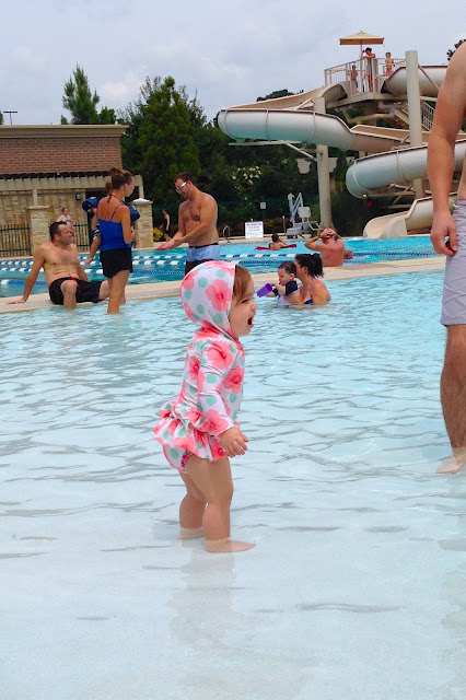 We were happy doing our typical water activities for a while, then something hit me mid-July–it was this internal panic that the end of summer (and thus the end of happiness for my water baby) was racing toward us. All of those water activities I lazily pushed off, saying, “Oh, we’ll do that when it gets really hot,” all of a sudden flashed before my eyes. Truthfully, in the South, the heat can last straight up until Halloween, but since the “feel” of summer wanes with the coming of school, my water-baby-to-do-list moved up in my priorities. Among the half dozen things to check off of that list before the leaves start falling was visiting our gym’s pool, which is phenomenal. I don’t know why I’ve delayed so long on this particular one; it’s designed for family fun, it’s free and we’re there often anyway…so boo on me for not taking advantage of it!