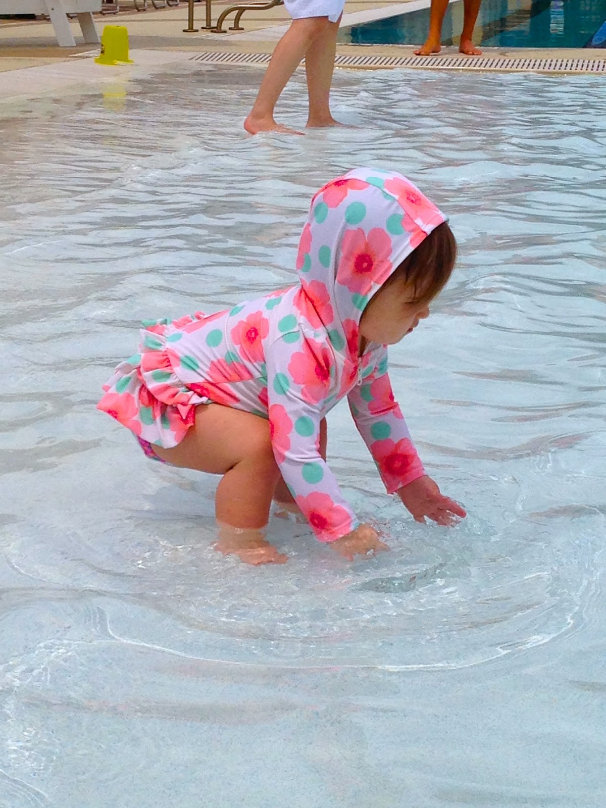I’m not a huge beach or pool person. Sure, they’re fine every once in a while, but I’d be just as happy spending my vacations in the mountains. (I blame childhood summers spent at camp in North Carolina instead of at the Gulf Shore.) HOWEVER, Emma Vance is a total water baby, meaning that this summer has been mostly about trying to figure out how to indulge her, whether it’s the big pool, baby pool, tub, sprinkler…or, heck, even traipsing outside in a good rain storm considering we’ve had a million this season!
