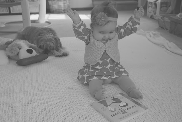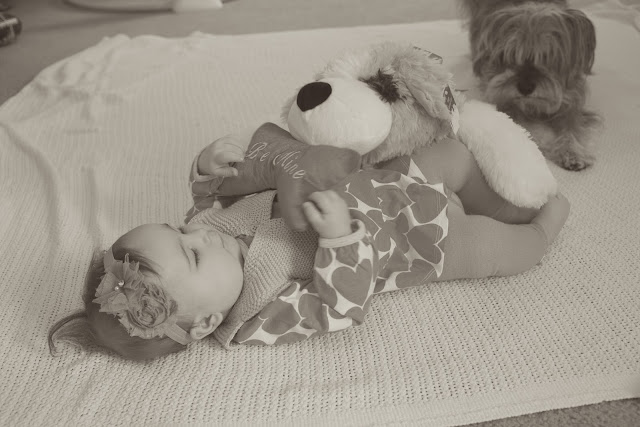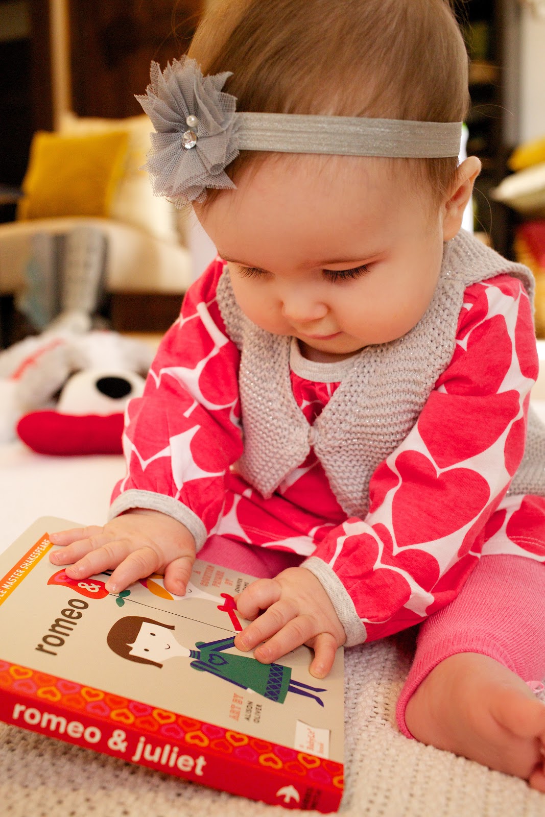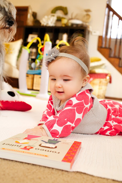 We’ve never been big Valentine’s Day people over here at the Shove household, but this year we’re spreading the {baby} love. I’m pretty sure Oscar, who’s obsessed with Emma Vance on any regular day, is even more enamored with her today, considering he didn’t want to leave her alone while we read our Valentine’s-themed board book, “Romeo + Juliet” this morning. (Hey, we like to start ’em young with the whole “education” thing; plus, the baby version doesn’t end so unhappily. :) ) Mrs. Emma Vance sent E.V. a puppy to celebrate today, and Oscar was unusually jealous of it…hmmm. Resemble anyone you know? Uncanny.