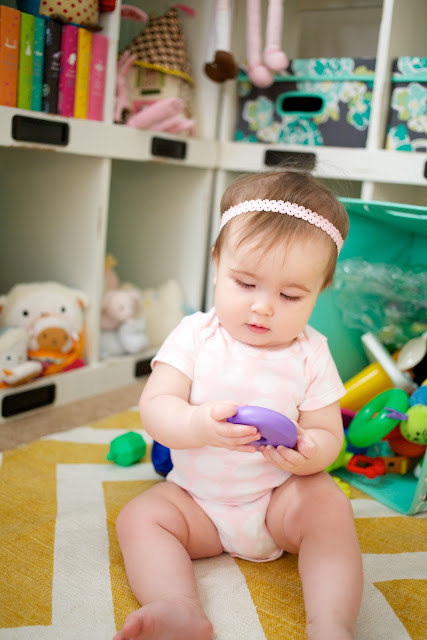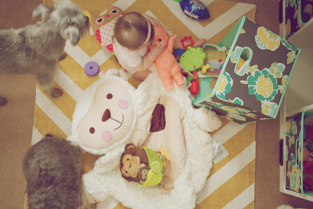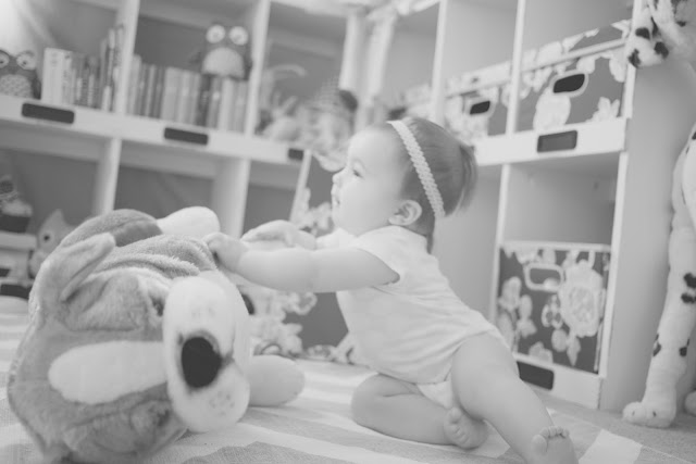 Emma Vance has been in tiny tot heaven since first day that I set her down to play. (Truthfully it made me sad that it took me so long to get around to this project.) It’s obvious that she loves having her own little space in our grown up world. She crawls over to her toys, dumps over the bins, peruses her books, pulls up on the shelves–all the while babbling to herself and her imaginary friends. It’s the sweetest thing to watch her playing, and it’s even sweeter to sit next to her and join in. I laugh to myself often, thinking of what must be going through her head as she explores–something about diapers or bottles or puppies or Sesame Street, I’m sure. I can’t wait to hear every thought of hers come rushing out of those tiny lips one day. She inevitably makes a huge mess of her corner, and as I’m picking up her toys each night I’m keenly aware of her innocence and youth. Sigh.