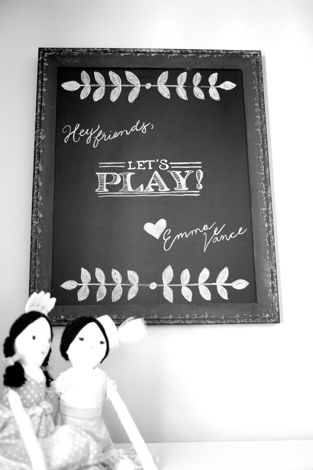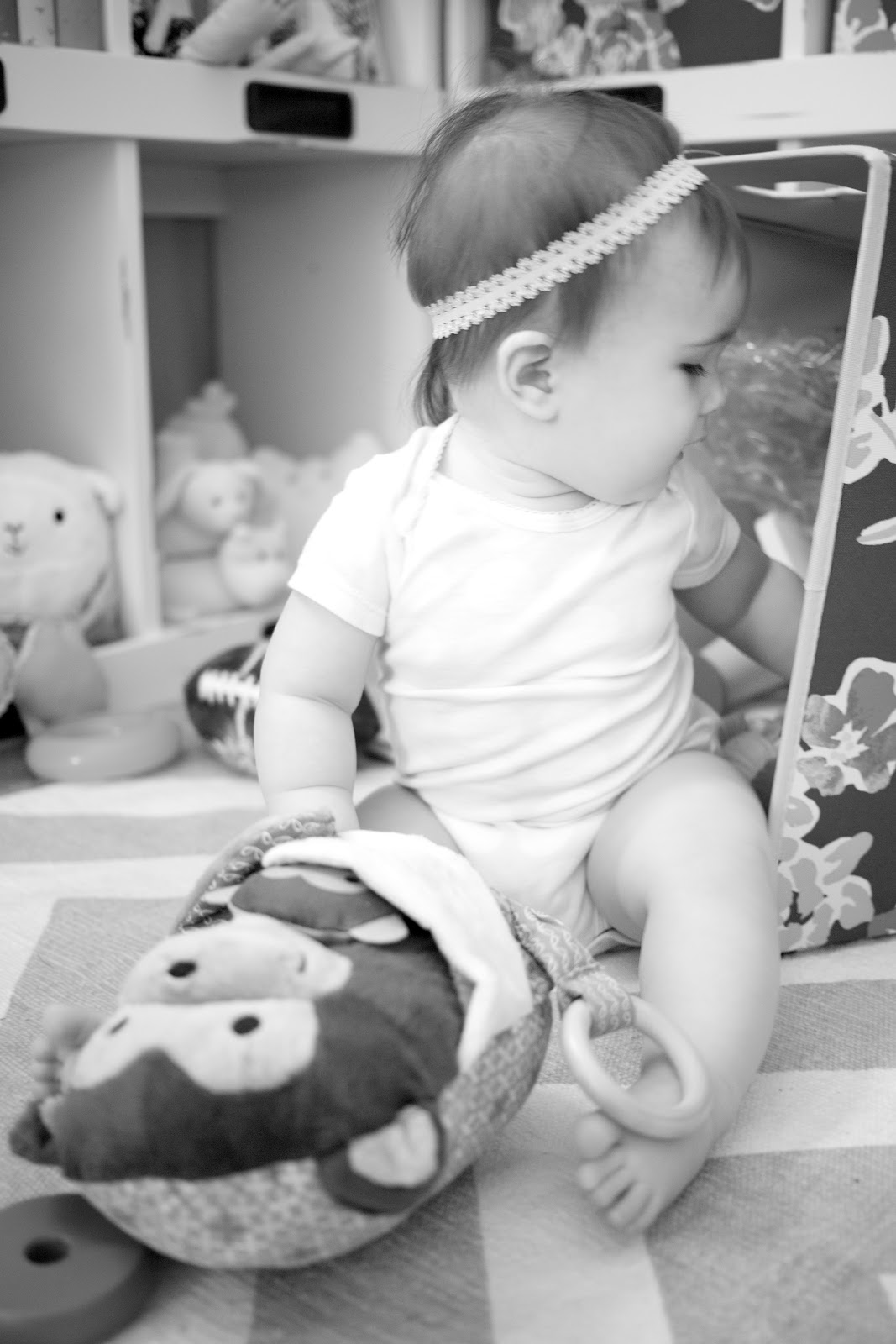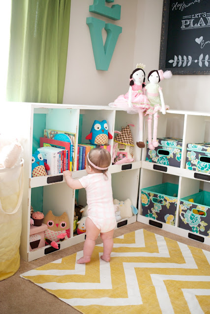 Emma Vance has been in tiny tot heaven since first day that I set her down to play. (Truthfully it made me sad that it took me so long to get around to this project.) It’s obvious that she loves having her own little space in our grown up world. She crawls over to her toys, dumps over the bins, peruses her books, pulls up on the shelves–all the while babbling to herself and her imaginary friends. It’s the sweetest thing to watch her playing, and it’s even sweeter to sit next to her and join in. I laugh to myself often, thinking of what must be going through her head as she explores–something about diapers or bottles or puppies or Sesame Street, I’m sure. I can’t wait to hear every thought of hers come rushing out of those tiny lips one day. She inevitably makes a huge mess of her corner, and as I’m picking up her toys each night I’m keenly aware of her innocence and youth. Sigh.
