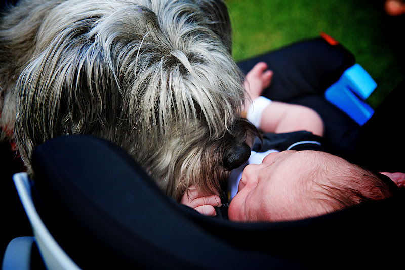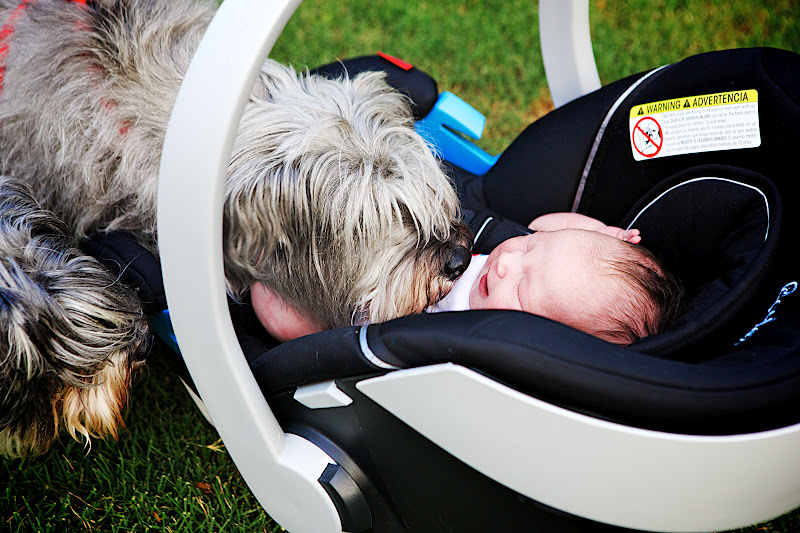 The first order of business was introducing Olive and Oscar to their new best friend, which we’ve been trying to plan out for some time. We had sent a baby blanket home for them to sniff and get accustomed to, and then when we arrived home, Ryan and I took turns going inside to say hello to them while the other sat with Emma Vance in the air conditioned car. Then I took the dogs on leashes and Ryan grabbed the baby in her car seat (for a quick exit in case the puppies freaked her out), and introduced them in the yard. (Let’s just say it was quite a “dance” in order to make sure that the dogs felt important and validated before meeting their new sister…) E.V. was a bit confused and thus perturbed by cold noses in her face, but other than that, we had no major problems! (Whew!) Oscar, who’s very happy-go-lucky, was thrilled, and hasn’t left her alone since. Olive, on the other hand, was a little slighted to not be the star of the family anymore and only sniffed her once before literally turning her back on E.V. and ignoring her. Ha!