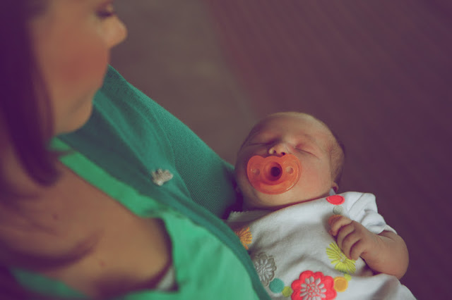 We were really worried about E.V. in the heat (man, we’ve missed some hot ones!), plus we wanted to get in one last afternoon nap before heading into the Great Unknown, so we didn’t leave until after 7 p.m. yesterday. Thankfully she was like a bug in a rug in the humid, hot air–I suppose because it reminded her of the womb? However, she did NOT like her car seat (which Ryan put in WHILE we were at the hospital; let’s just say we balance each other out on the planner/non-planner continuum), and upon realizing that the only solution to her misery was to head home quickly, we left the hospital with a crying baby and a little anxiety. Thankfully, the second we got on the highway, she passed out from the motion, so Ryan and I were able to relax and enjoy the ride home.