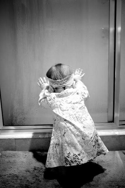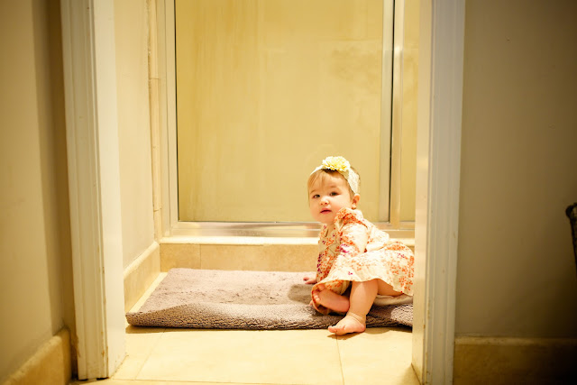 HOWEVER, one day it occurred to her that I was in that noisy, steamy shower, and she lost it. I initially thought she had bumped her head or something, so I cut my shower short to tend to her. When I jumped out and picked her up, she stopped crying immediately. I didn’t think anything of it until the next day when it happened again! This time she crawled over to the shower, pulled herself up and started banging on the door and bawling. Hmmm. This went on for a week or so, each day getting worse, until I decided to deduce what was causing her all-of-a-sudden-angst. I began by just running the shower to see if it was the noise of the water that bothered her. Nope. The next day I pulled her into the shower with me, thinking she was curious. Definitely not. The third day I stood in the shower fully clothed with no water running. She was happy, and clearly thought I was being silly. I even tried to get Ryan to distract her with playtime while I jumped in the shower. She wasn’t fooled. I then resorted to showering with the bathroom door closed, but she’d just bang on the door and sob her heart out until I emerged. Dang.