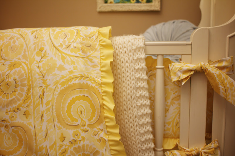 I decided to let a professional seamstress make the bedding, which was definitely wise. Because our crib is so oddly shaped, it took me enough time and energy to put together the instructions on how the items (the bumper in particular) needed to be constructed that I was over it before a stitch was even sewn. In fact, throughout the process of having the bedding made, the seamstress even expressed how difficult of a project it was, so I’m glad I didn’t waste my time. I ended up having her make a bumper, toddler duvet and throw pillow. The yellow crib sheet’s store-bought, and the tiered, ruffled burlap bedskirt is my handiwork.