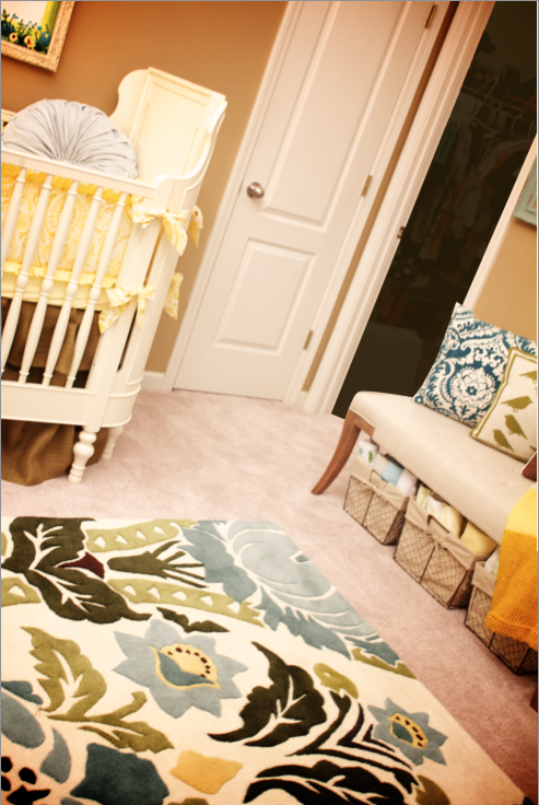 Oh, the rug. This was perhaps the hardest decision for me in the whole nursery. The moral of my rug dilemma is this: Go with your instinct. When I first thought about adding blues and greens to my color scheme, this rug was the first one I found, and I was instantly in love. However, just like any OCD person would do, I had to look through about a thousand (literally) other options and hem and haw for about six weeks before ordering this one. (Hey, it’s a big statement piece in the room, and I’m going to be stuck with it for a long time, so I wanted to be sure…) When it came in, I was so pleased, and since then it’s been a major inspiration for my other elements (especially the paintings).