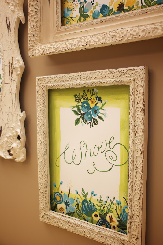 I’ve owned these eclectic frames for a while, and thought they’d be perfect for over the crib. Originally I was just going to do Etsy-ish letters in them to spell out her monogram, but I was feeling inspired to paint, and took the opportunity to add color to the walls. Unfortunately I had to “white out” our baby girl’s first and middle names in the pictures (since we’re keeping it a surprise), but you can get the idea of what they look like from the “Shove” frame: