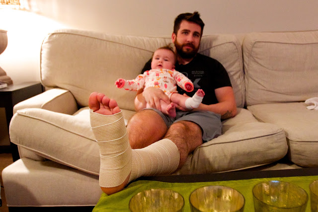 When Ryan told me that he’d love to play flag football on Saturday (one of his favorite yet rarely indulged pastimes), I knew that something bad was going to happen. Call it intuition, call it reason (being 31 + sports + not realizing you’re 31 = bad), call it what you will, but since I’d been feeling like a bad wife lately, my guilt won out and I held my tongue. The guy works SO hard, and it seems like lately I’ve been asking a lot of him in his precious spare time. When he asked if I minded him playing a game or two, I just couldn’t crush his dreams. The fact that there was a group of guys he knew already playing AND the fact that Ryan was actually available to play seemed a bit like fate. (Too bad it turned out to be fate tempting Ryan…) So despite that nagging voice in my head telling me to make him stay home, I smiled and waved him off, my final words being, “Just don’t get hurt.”