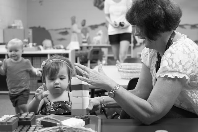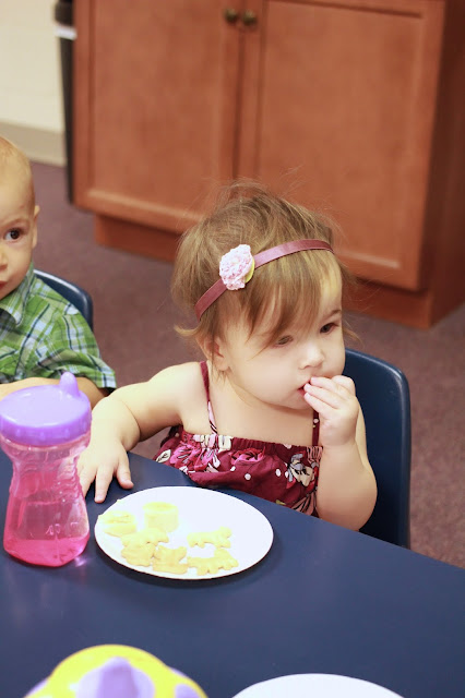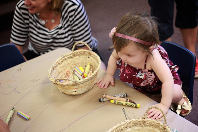 After a morning full of debacles, I’m glad to say that E.V. had an awesome FIRST first day of school! Emma Vance has never been shy or tearful at my absence, but you never know with a new environment, meaning that a morning full of fun and free of crying was a win. E.V. was like a fish in water, happy to explore a new place with new faces. There were toys and kids and crayons, snack time and books and nice teachers–and we even peeked in on a music class on our way out. The only hitch is that she has to learn not to put things in her mouth :/, which was a rule she tested over and over and over today. Oops, we haven’t really crossed that bridge yet in our home…sorry about that! {insert anxious laughter as I pull a crayon out of her mouth for the FIFTH time in an hour}