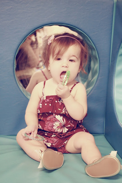 The 1s class is only one day a week for three hours, and it’s almost like an “Intro to Preschool” class. I figured that it was a good way to break her in for next year’s real preschool schedule, a great way for my social child to be around other one year olds, and an enticing way for me to get some “stuff” done without a child clinging to me (read: FREEDOM!). The class does “gradual entry,” which means that today we went for one hour with the kids, next week they’ll go alone for two hours, and then finally the third week will start the normal schedule. This system was great because although E.V. was perfectly happy to play without me, I got to see her happiness firsthand and to meet some of the other parents in the class. Plus, let’s be honest, this whole “gradual entry” method just as much for the moms as it is the kids. :)