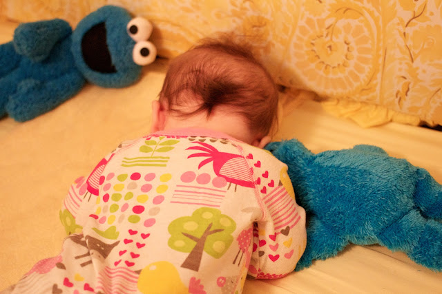 (In case you were wondering, yes, she sleeps with TWO Cookie Monsters.) |