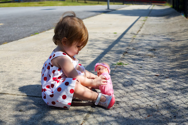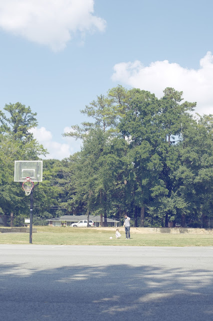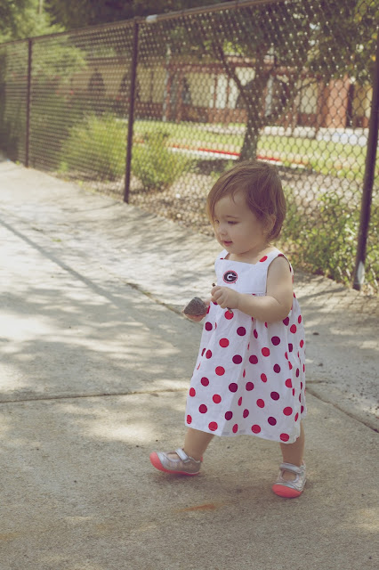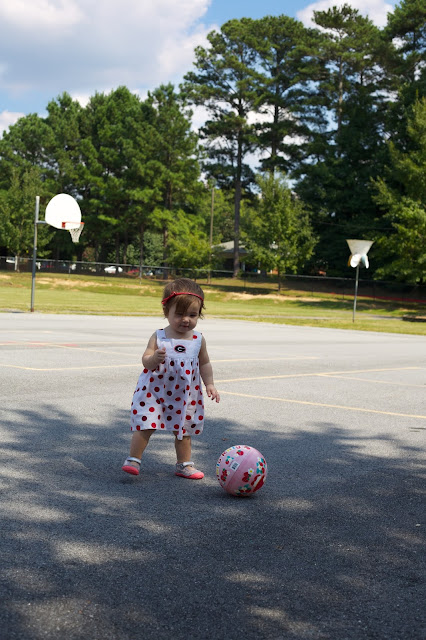 In an effort to urge the afternoon hours to pass quickly before today’s UGA v. South Carolina game, Ryan, Emma Vance and I took a stroll to our closest elementary school to play on the playground (or rather, to play on the concrete court they call a playground). It was an effort for all three of us to burn off some energy, although the grown ups’ energy came from stressing about the game and E.V.’s energy came from…well, from being a kid. :) It must’ve worked (all that ball-chasing, rock-throwing and, yes, dirt-eating) because we managed to be calm, cool and collected by kick-off–and so were the Dawgs. Maybe Aaron Murray and Gurley took a quick playground break to ease their nerves before the game too? :)
