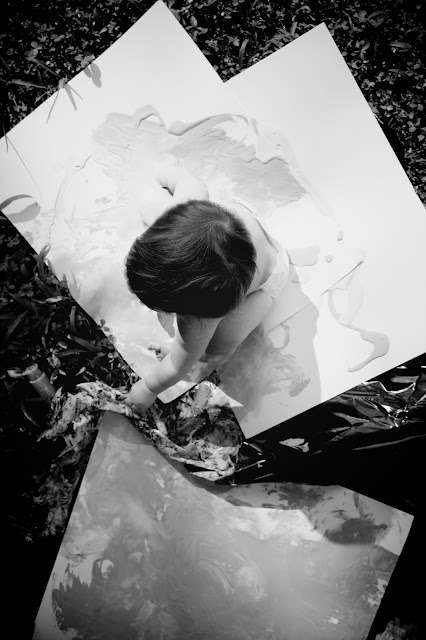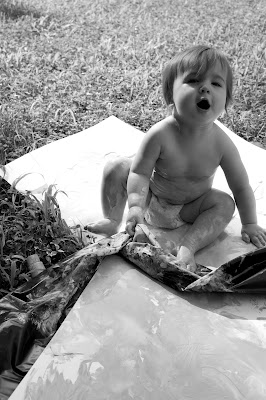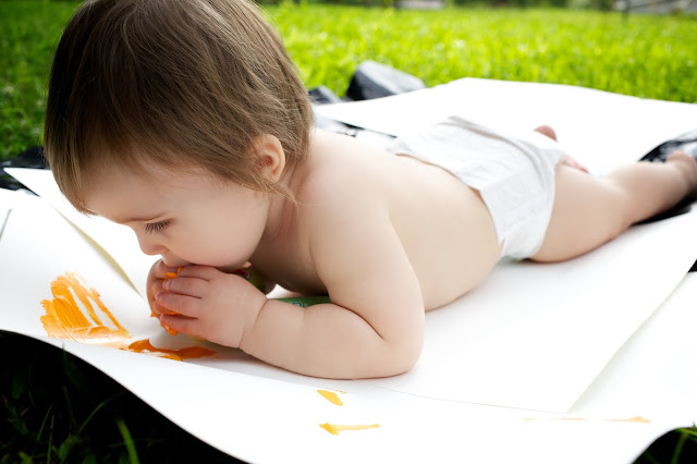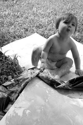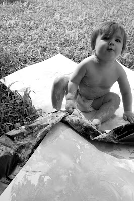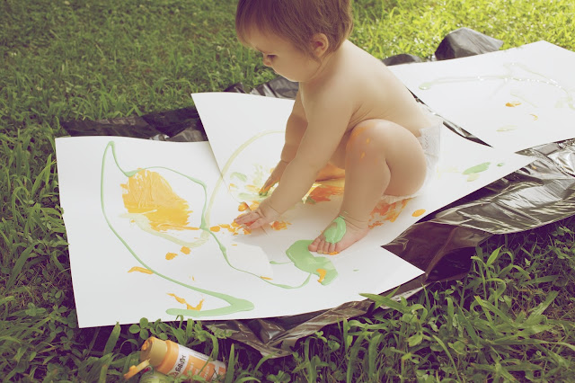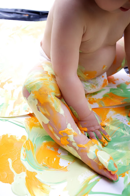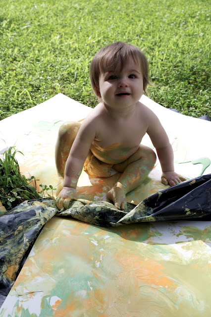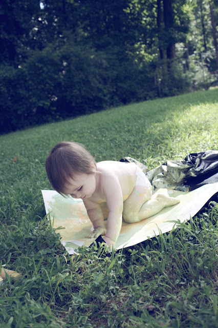 It was messy, but it was fun. Emma Vance was stripped down to her skivvies as she crawled around, scooted about, and rubbed her tiny little peach-and-mint-paint-covered hands all over the paper, creating her very first set of paintings. We laughed as she learned the hard way that eating paint is not enjoyable, but overall we just had a good time playing. What kid doesn’t like to get messy, right?