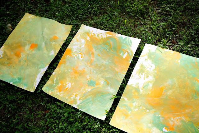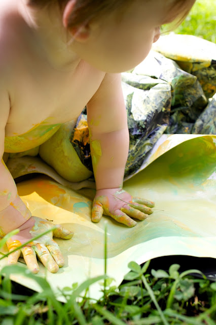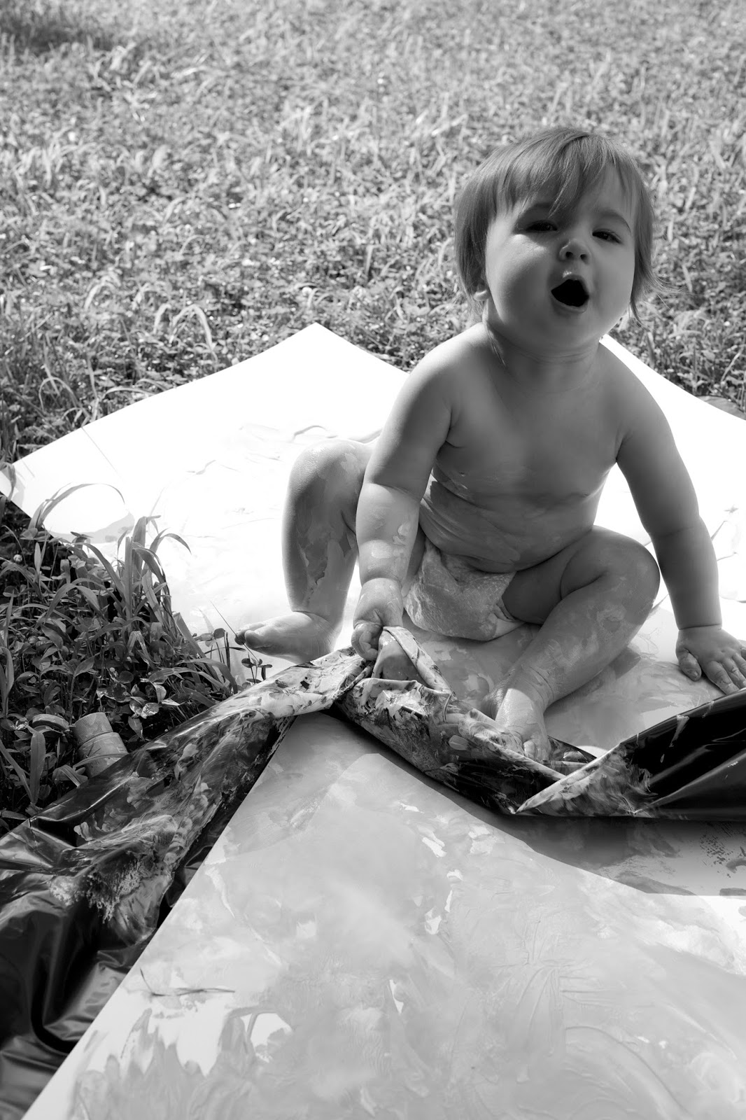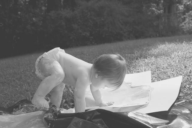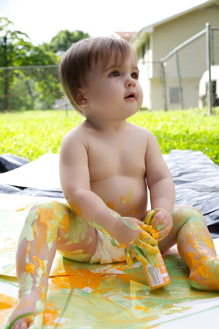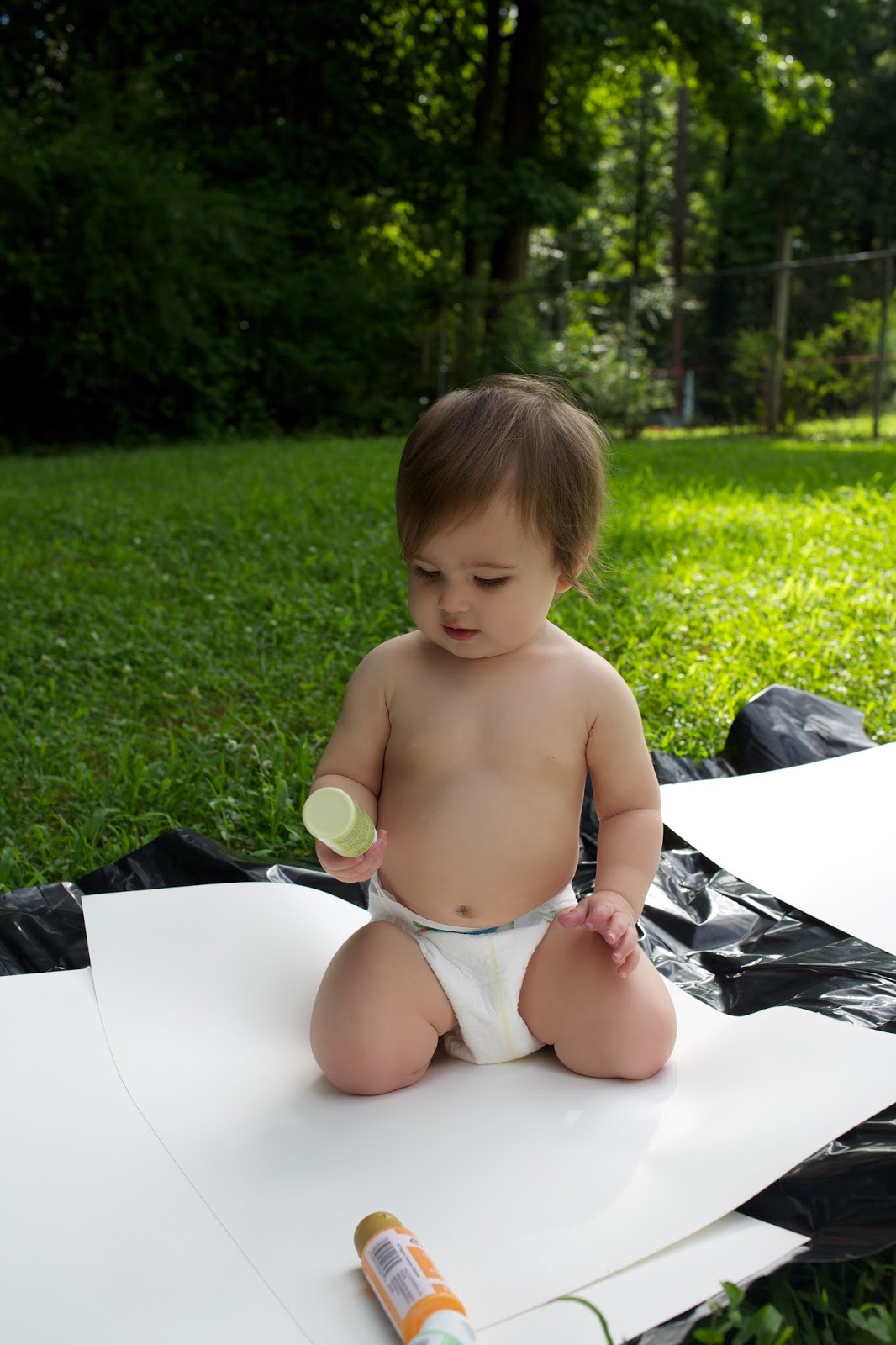 It was messy, but it was fun. Emma Vance was stripped down to her skivvies as she crawled around, scooted about, and rubbed her tiny little peach-and-mint-paint-covered hands all over the paper, creating her very first set of paintings. We laughed as she learned the hard way that eating paint is not enjoyable, but overall we just had a good time playing. What kid doesn’t like to get messy, right?