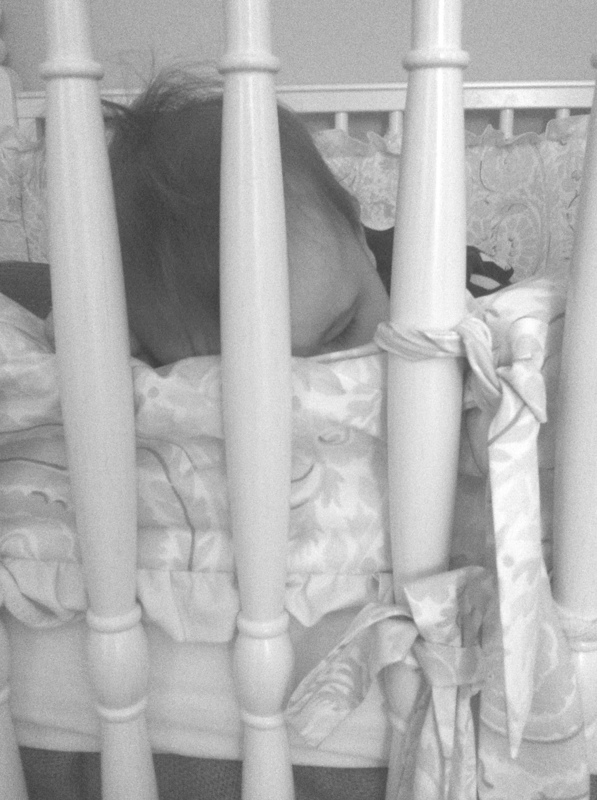 She cried for a few minutes, and since I had a camera handy, I thought it was a good moment to catch a shot of what Ryan and I have deemed “Baby Jail;” lately, when I lay her down in her crib to sleep, E.V.’s been pushing down the bumper and reaching out from between the spindles like a tiny prisoner. It’s both heart-wrenching and hilarious, and often she falls asleep with her little head crushed up against the bumper mid-cry.
