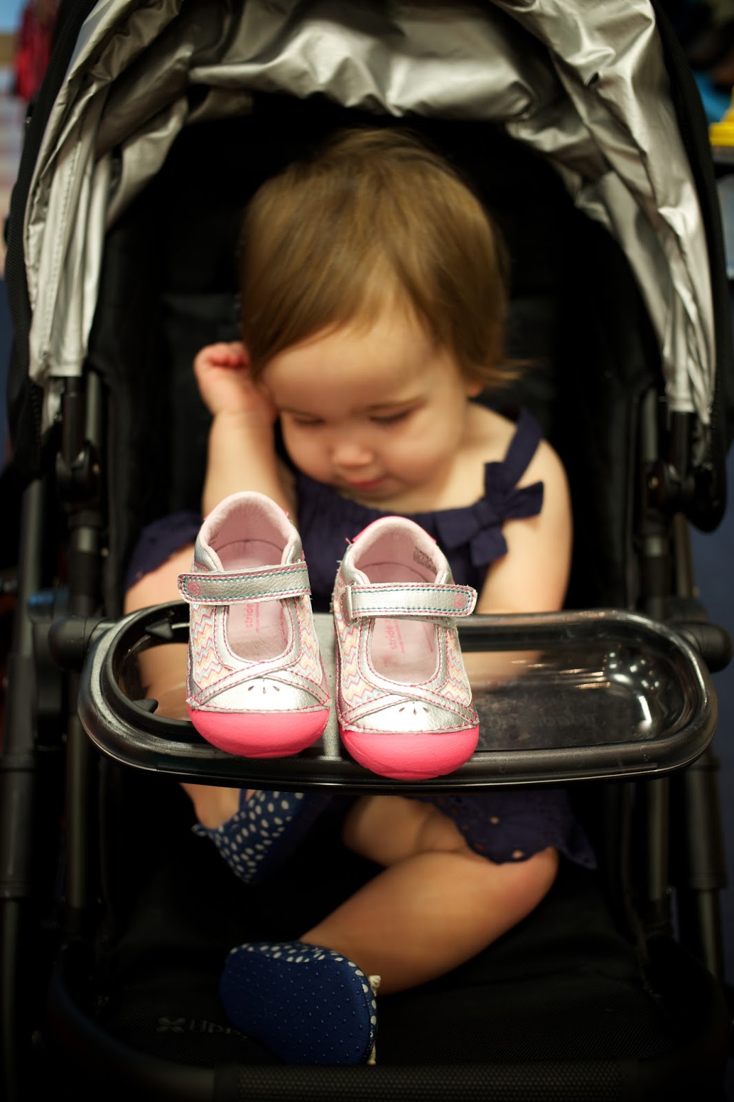But finally I’ve caved. The straw that broke this camel’s stubborn back was this: THE AIRPORT. We’re headed to D.C. soon, and with the date quickly approaching, I’ve been having nightmares of my barefoot child toddling around Hartsfield-Jackson, picking up ecoli and God knows what else. Resolved that it doesn’t matter what they look like, Emma Vance and I ventured to Stride Rite today–and actually bought a pair of walking shoes! Yay!