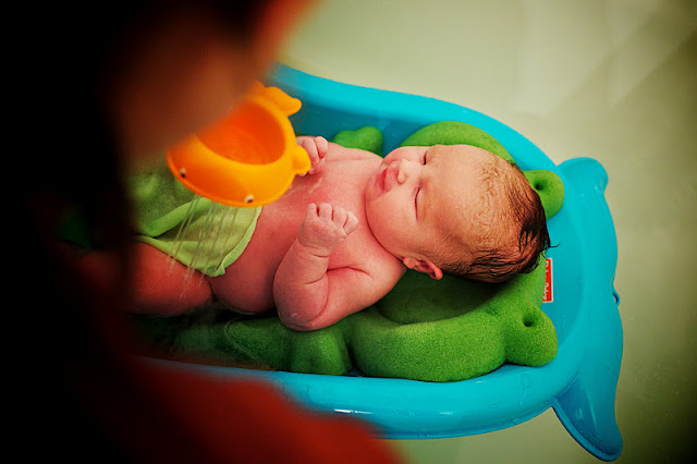 Smelly Belly survived for a few days post-cord with sponge baths, but last night we decided to pull the proverbial plug and give her a real bath. She was a bit perplexed (as is to be expected), but seemed to LOVE the warm water and attention. Despite getting a little water accidentally dumped on her face (bad mom!), eating a soapy hand (and NOT reacting badly to it…could it have tasted good?) and ultimately pooping in the water (hey, she was relaxed!), it went very smoothly. As a result of such a lovely scrubbing, her hair has become all poofy! It’s definitely in faux-hawk territory, and we’ll need a couple of days of wear to have it settle back down again.