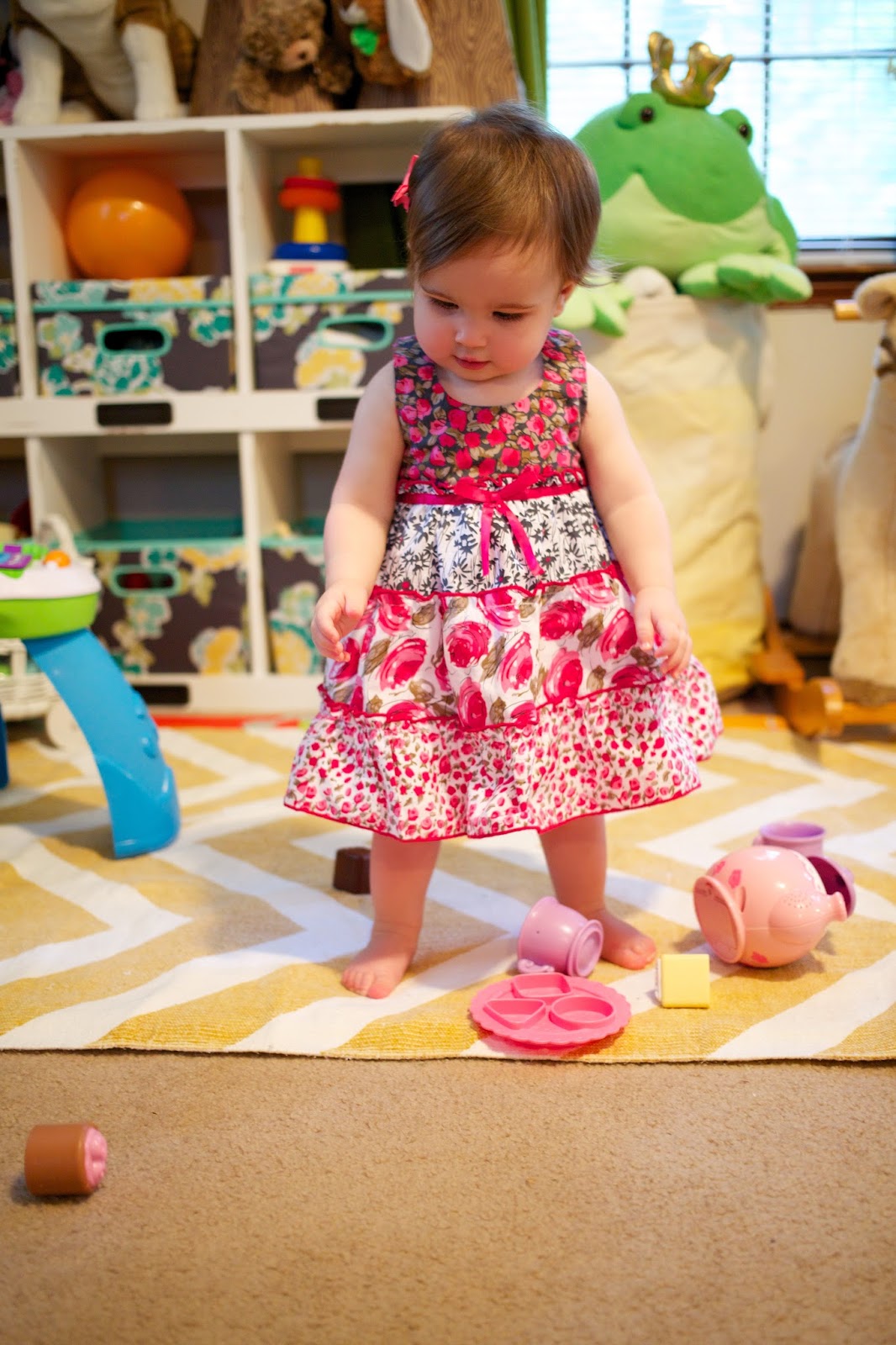 E.V. received a talking tea set as a gift last month, and since then has had a slight obsession with tea parties. (And by “slight,” I mean “every night.”) The teapot talks, which in and of itself causes fits of giggles from our little lady, but the true heart of her obsession has been the ritual of “serving” tea. She loves to have her party all set up, cups, saucers, spoons, teapot and treats, on her play table each night, where either Ryan or I are the guest of honor. We sit while she stands, hostessing. She stirs our tea, serves us treats (her favorite thing to do since we then pretend to eat the treats, which is hilarious in baby world) and has polite conversation. It’s a sweet time where she gets to run the show, and we love every minute of it. These tea parties have me dreaming of the age where we can actually have real tea parties together, with cookies and sandwiches and apple juice as “tea”…Oh, hurry little one and become a little girl! :)
