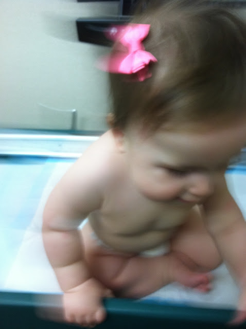 Let me first say–this whole getting-E.V.-to-sit-still thing is getting hard. VERY hard. She’s a wiggle worm, and for some reason the doctor’s scale is the wiggliest place for her. Since these weigh-ins are informal and impromptu, I do the weighing alone, but she was extra squirmy this time around–so much so that a doctor came out of her office and offered to help. Merp. :/ I suppose next time I’ll have to keep my laughter and chastising down a bit more.