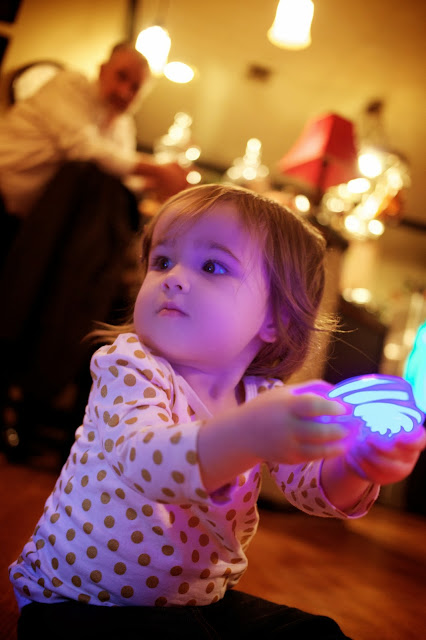 With my brother and sister-in-law and E.V.’s four cousins having just moved to California and Ryan’s brother and girlfriend traveling for the holiday, we had the rare treat of having both my family and Ryan’s family together for Thanksgiving. Wendi and Mike hostessed my mom, dad and oldest brother, and it was so nice to only have one house to visit for our holiday festivities. The gist of the typical holiday madness didn’t change much by combining dinners, however: E.V. ran around like a wild child, climbing on everyone, dancing, begging for snacks, playing with toys and reading books while Wendi and Mike cooked a fabulous dinner. (I’m still full four hours later!) My dad made for entertaining and outrageous conversation (as usual); I picked Jon’s brain about HTML code (his world, not mine); and Ryan carved his first turkey (like a freakin’ boss). It was a fun night to have the two families together for a meal, and afterwards as we all packed up leftovers, Emma Vance explored the glowing lights around Wendi’s house.