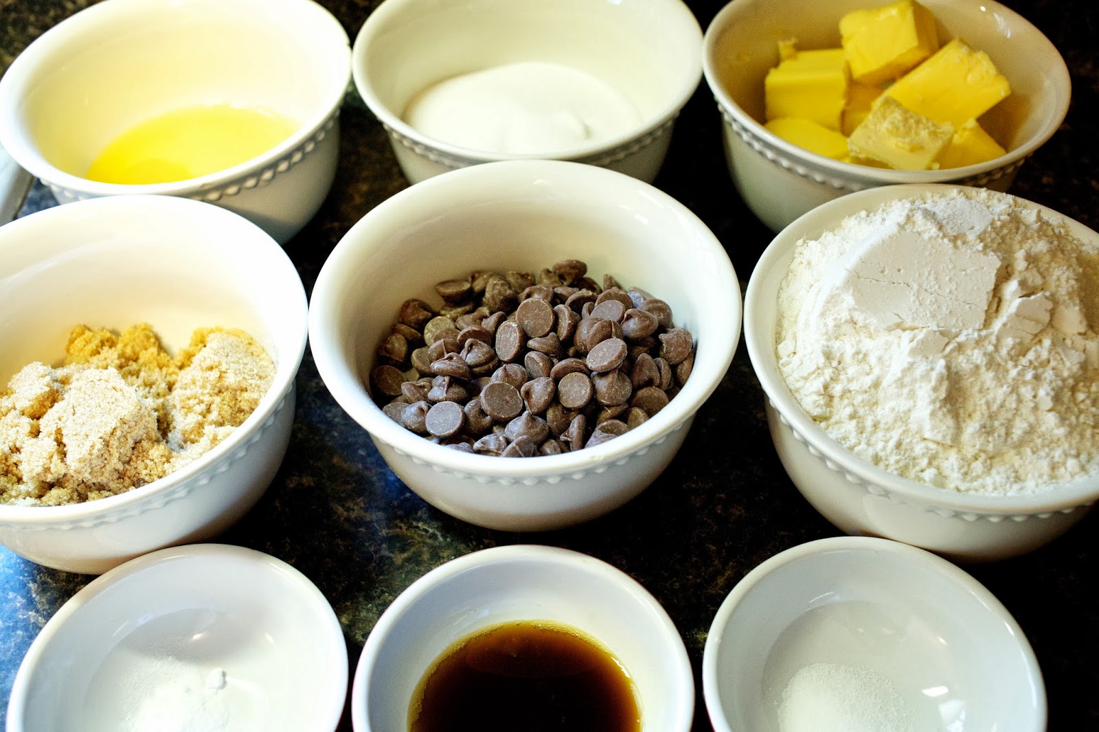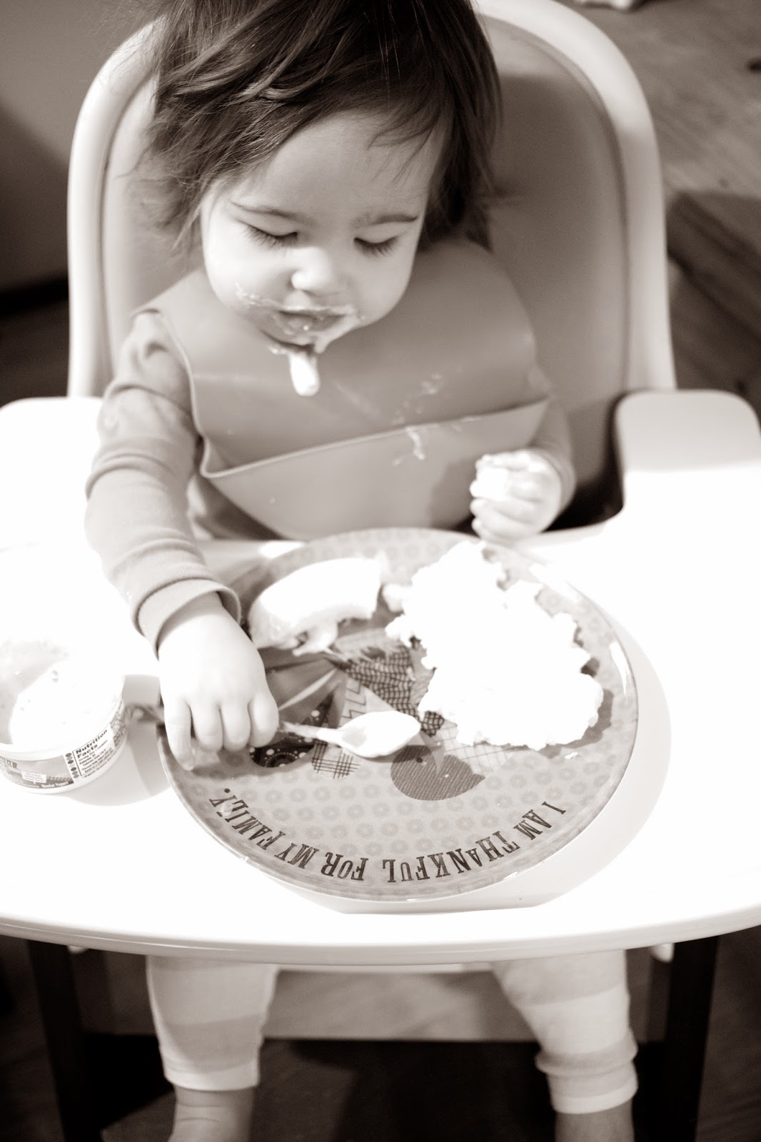 Ryan was still enjoying his holiday by sleeping in, so I decided to get in the spirit of the season by baking cookies (E.V.’s first time!). Despite deciding to bake on a whim, I randomly happened to have all of the ingredients on-hand–which I was thankful for because it was so FRIGID out this morning that there was NO WAY I would’ve made the trek to the grocery store to fight over flour with the last-minute Thanksgiving chefs. ;) I decided the best way to incorporate a one-year-old into my project was to bake cookies mise en place, so I measured everything out before pulling Emma Vance up onto a chair next to me. I had envisioned her enjoying dumping the bowls of ingredients into the batter, but, as I should have expected, she was more interested in taste-testing the chocolate chips than actually helping me. Go figure. Oh, well! Whatever floats your boat, kid! And then, of course, she had to taste-test the batter for approval before I placed the cookies onto the baking sheet. That’s my girl! It ended up being a fun activity for our quiet Thanksgiving, and Ryan was ecstatic to wake up to freshly baked chocolate chip cookies in bed! We spent the rest of the morning watching the Macy’s parade, playing and napping, and then it was time for the Turkey Day festivities to really begin!