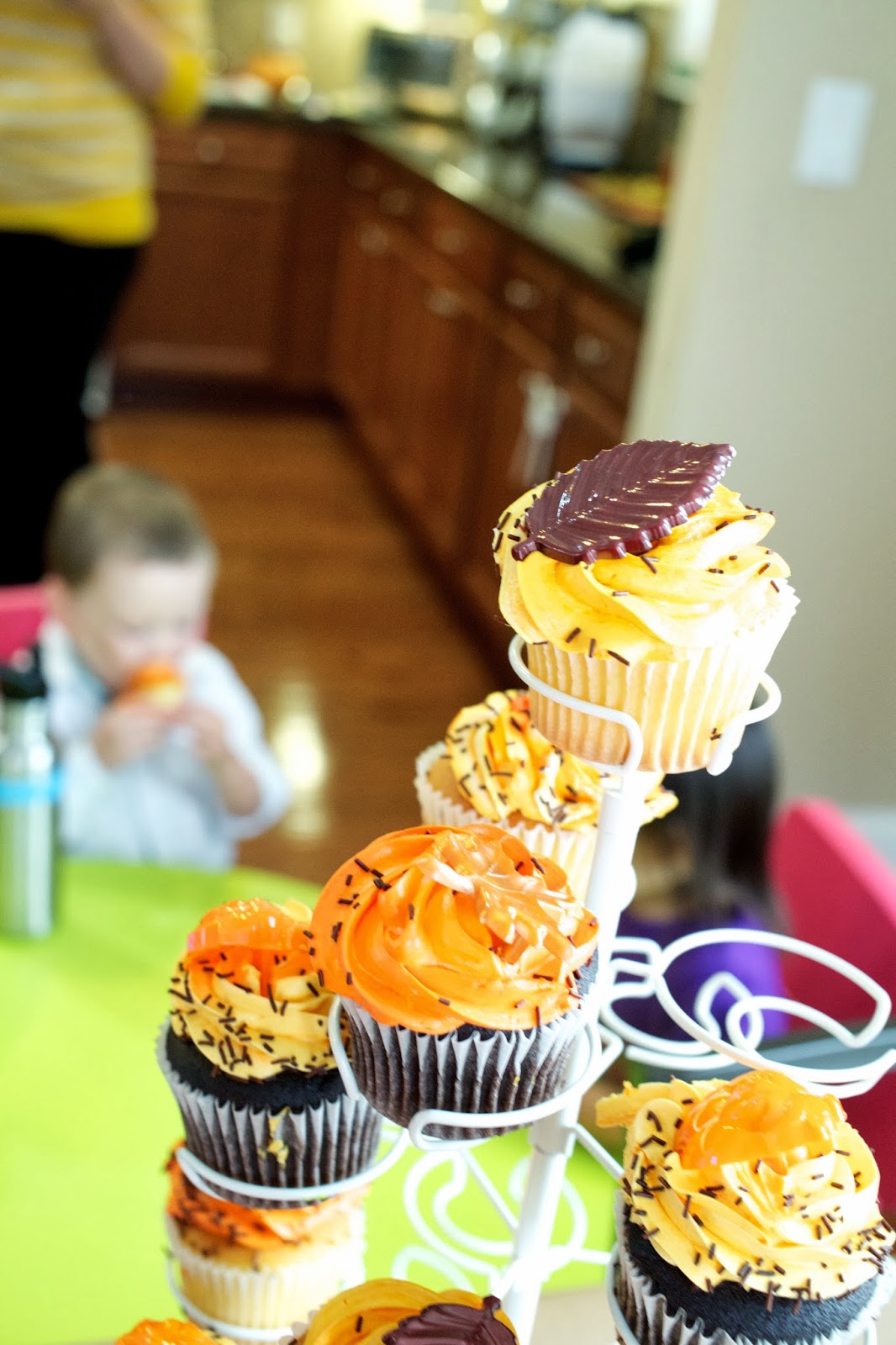 My contribution to the play date was rather tame (in Talie terms)–just some cupcakes. Some store bought cupcakes. (Shhhh! Don’t tell!) I had visions of grandeur when it came to my dessert responsibilities; cupcakes had been requested, and my plans included decorations that would’ve surely taken twice as long as the actual baking would have. However, after dinner last night I had a moment of panic as I realized that Toddler Thanksgiving was in the morning. (How did that sneak up on me so quickly? I blame vacation.) I ventured out into the cold night to pick up baking supplies, but upon wandering through the bakery section of Publix, I thought, “What the heck? Who cares? Certainly not the kids…” Resolved that I don’t have to do everything super-creatively, I grabbed a dozen pre-done cupcakes and called my duties completed. It worked out well, considering the toddlers spent most of the play-and-craft time begging to eat the cupcakes, although I did NOT think through the yellow and orange frosting very well. It ended up everywhere, including staining E.V.’s white top. ;) Oh, well. Next year, sugar cookies…that is, IF we lose our minds and opt embrace the madness again! :)