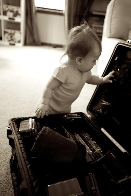 Side note: E.V. is standing up on her own, and I am totally freaked out. It was one thing to help her up, to have her rely on us to get her on her feet, but when I left her alone in the living room for a few minutes and returned to find her standing completely upright digging through Ryan’s case today, I officially lost it a bit. I’m not ready! I’m not ready!